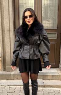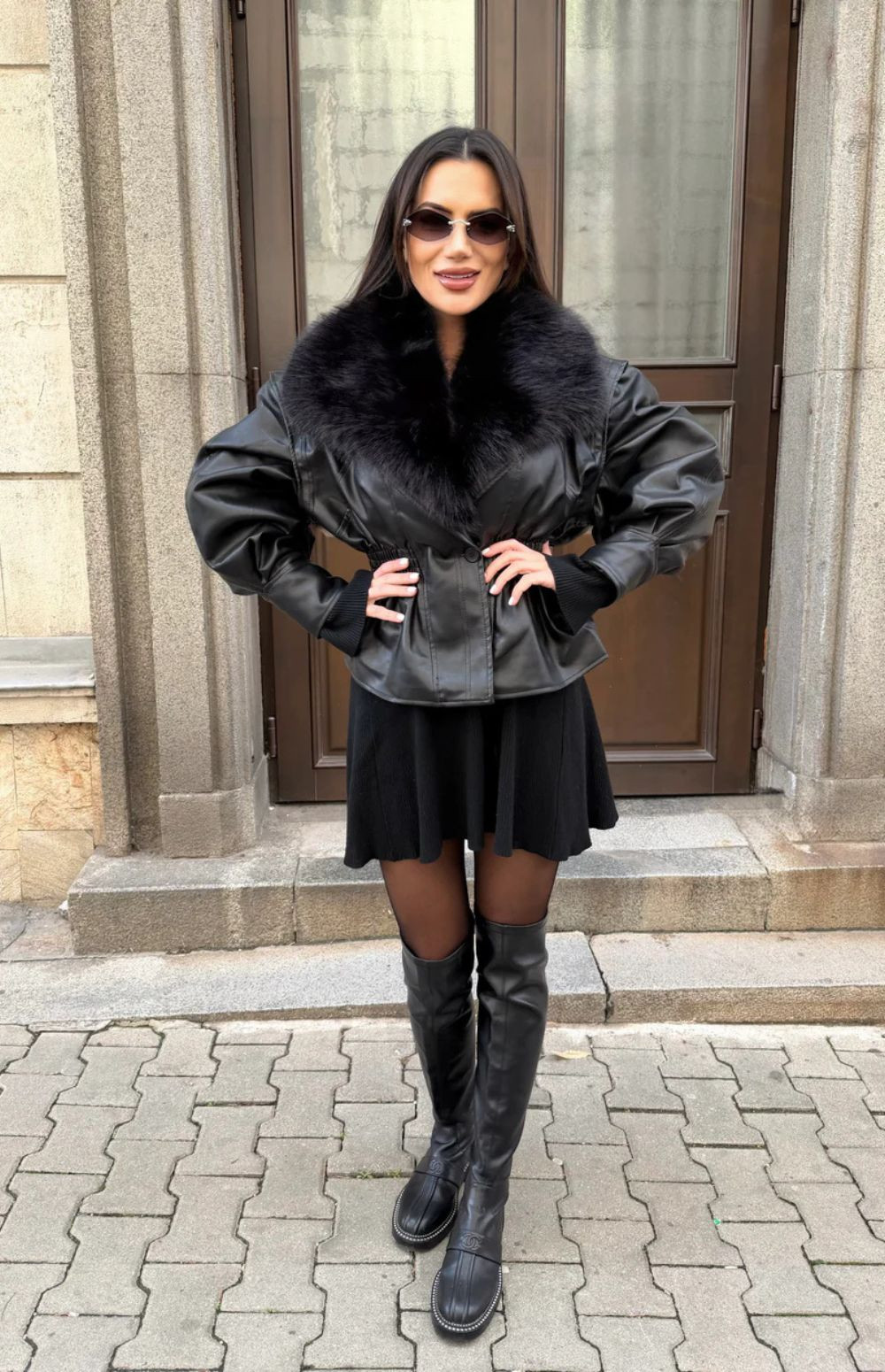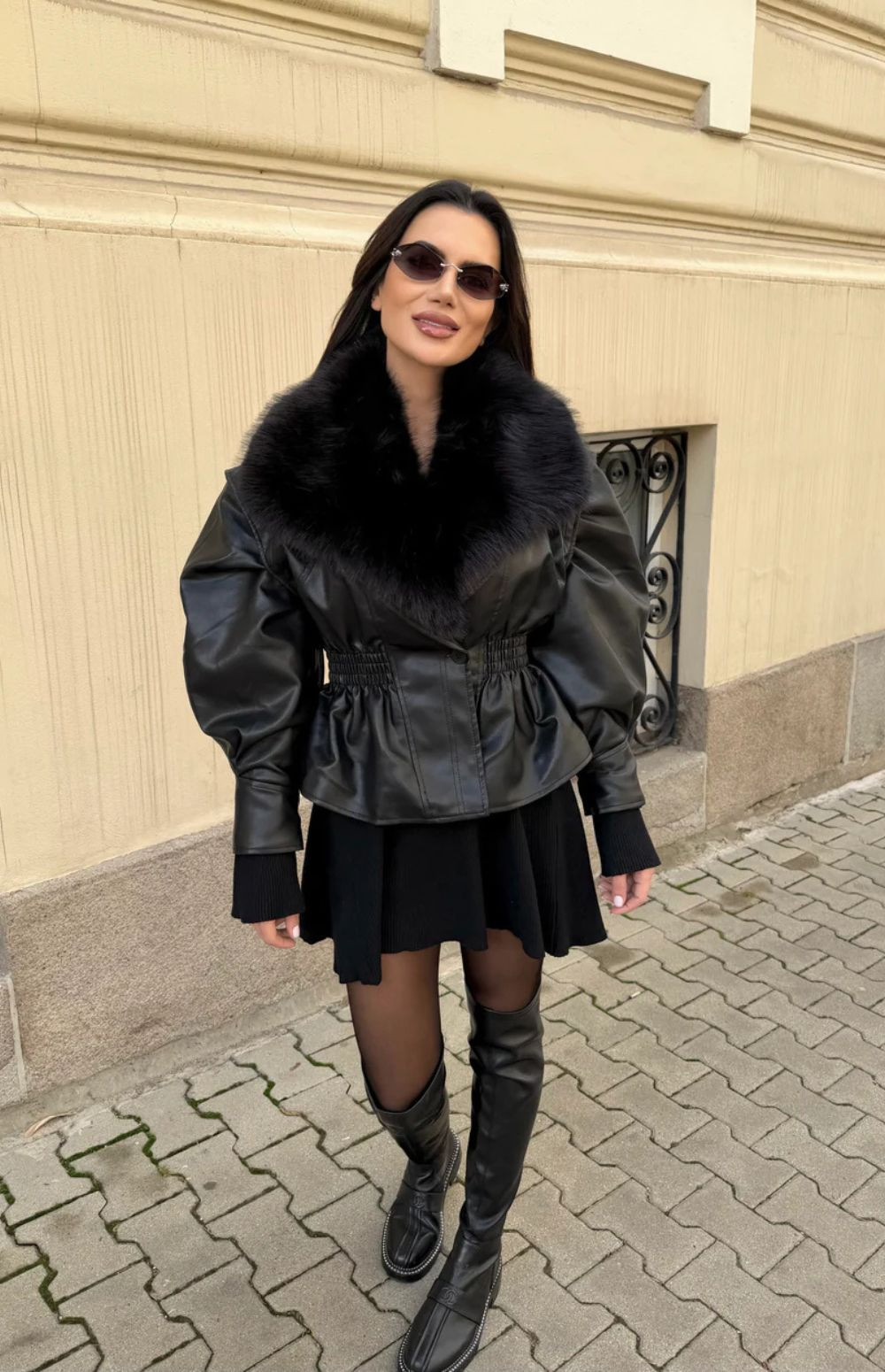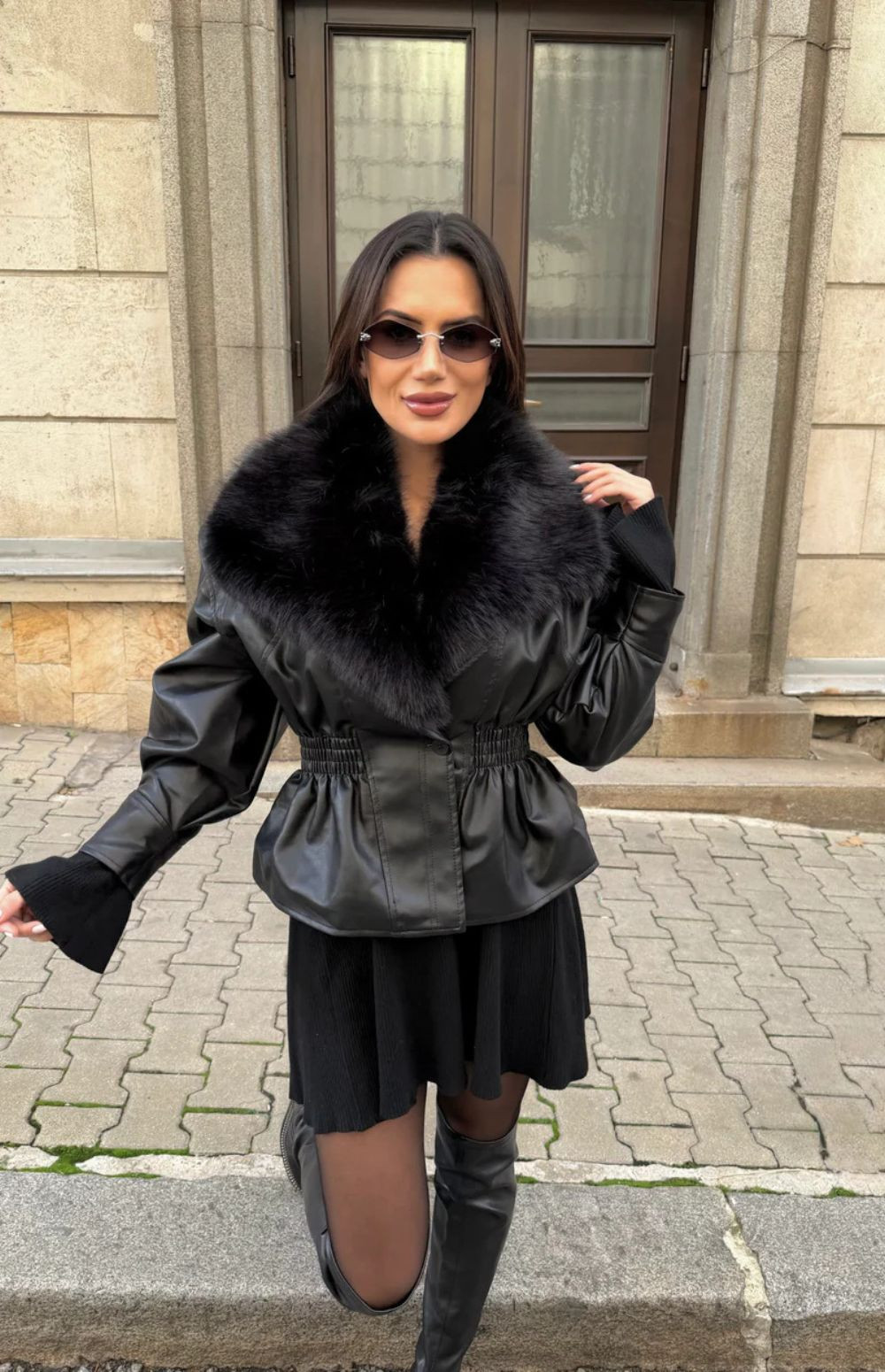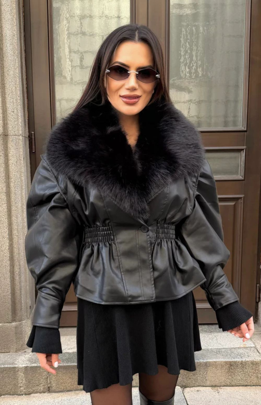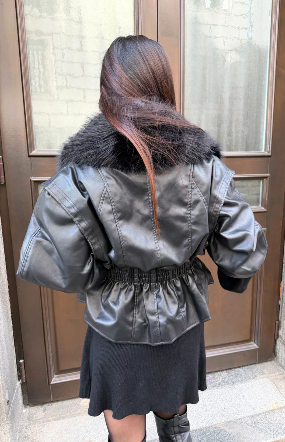 FAUX LEATHER JACKET WITH FUR & CINCHED WAIST