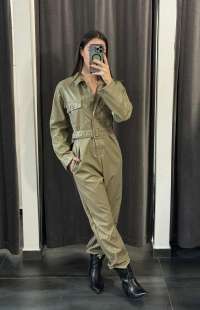 Faux leather jumpsuit with belt and pockets
