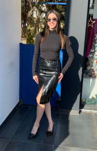 Midi skirt in lacquered eco-leather, high waist with belt and loop. Front slit and pleat detail. Zip fastening.