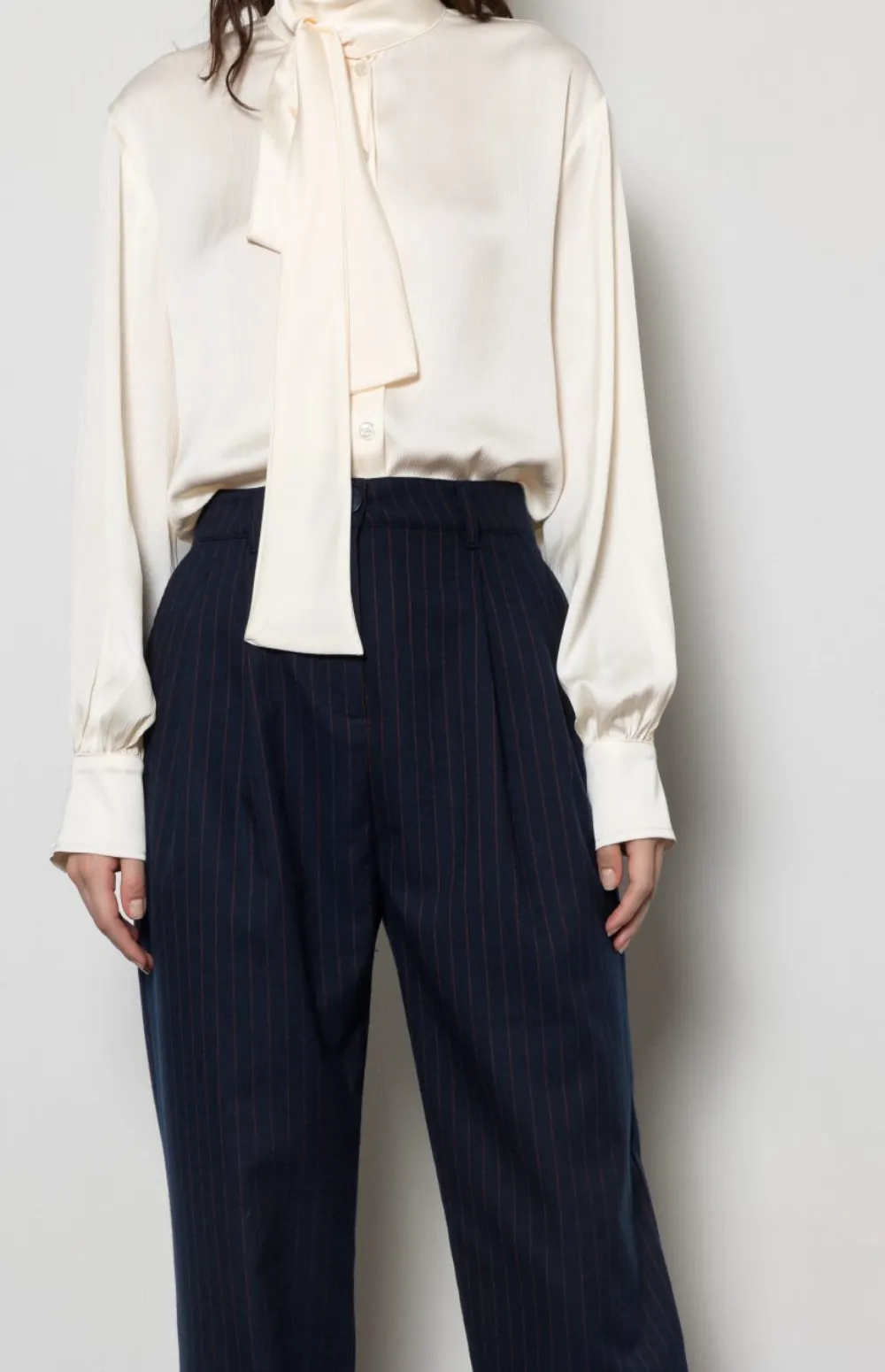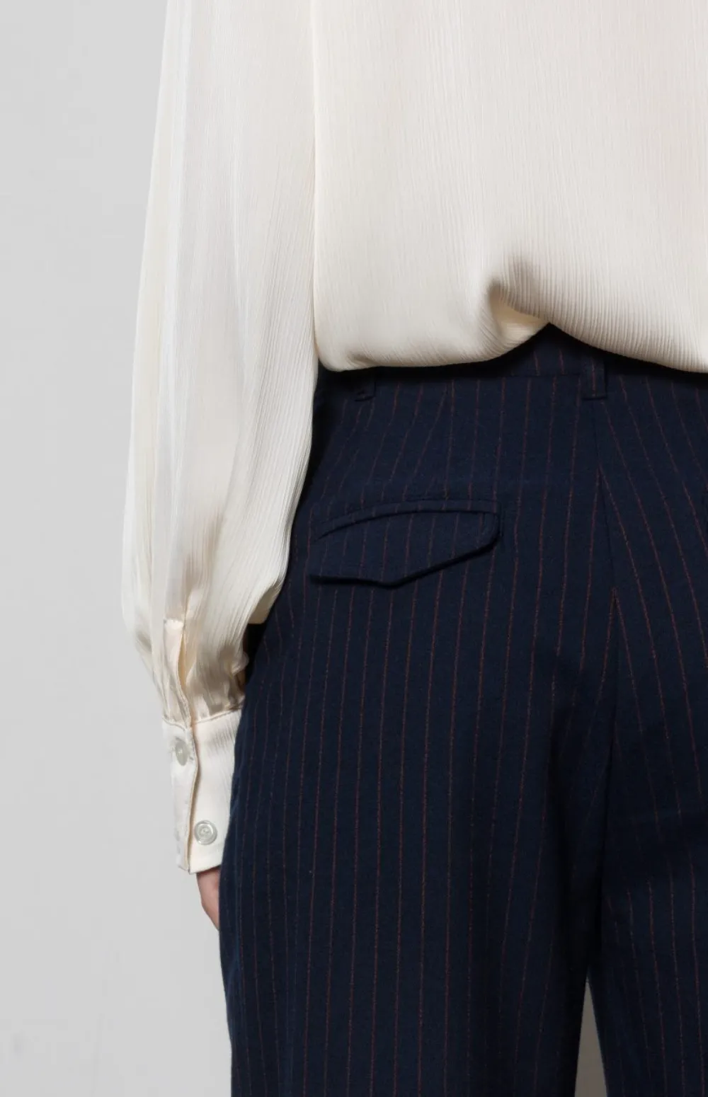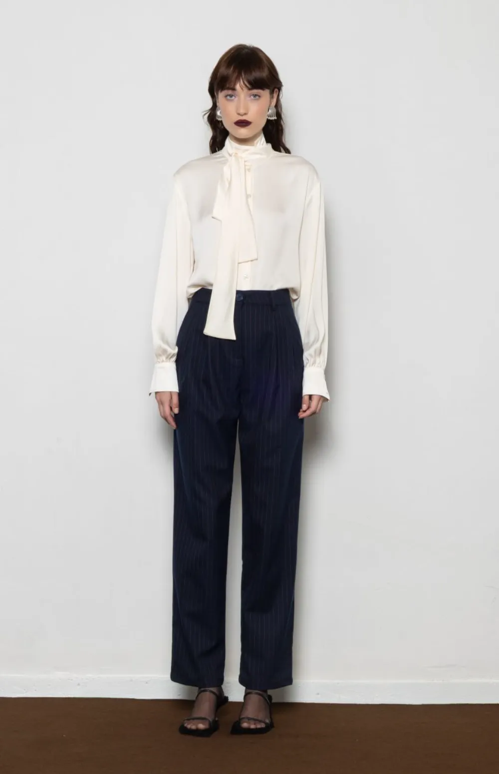 High-waisted blue stripe trousers with front pleats and a straight-leg silhouette — timeless tailoring with a refined, menswear-inspired edge.