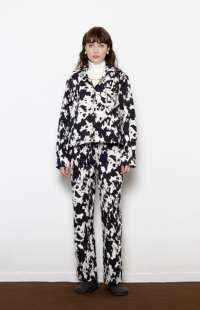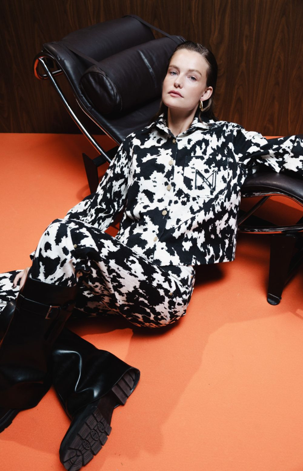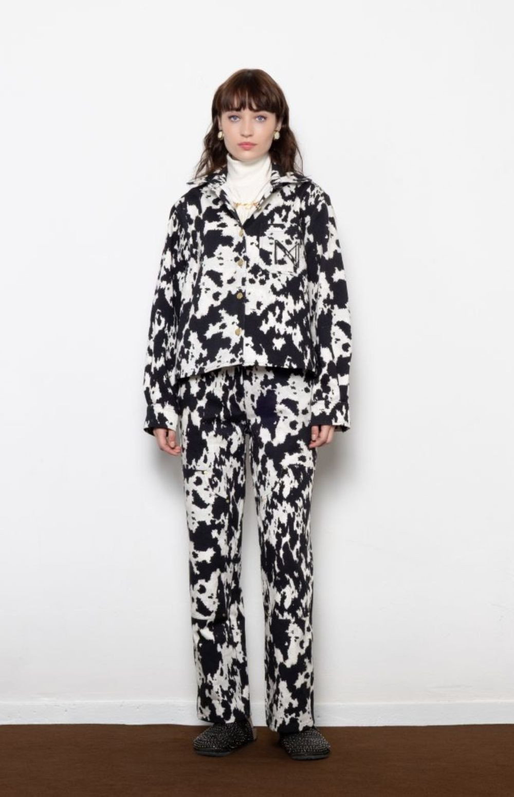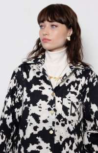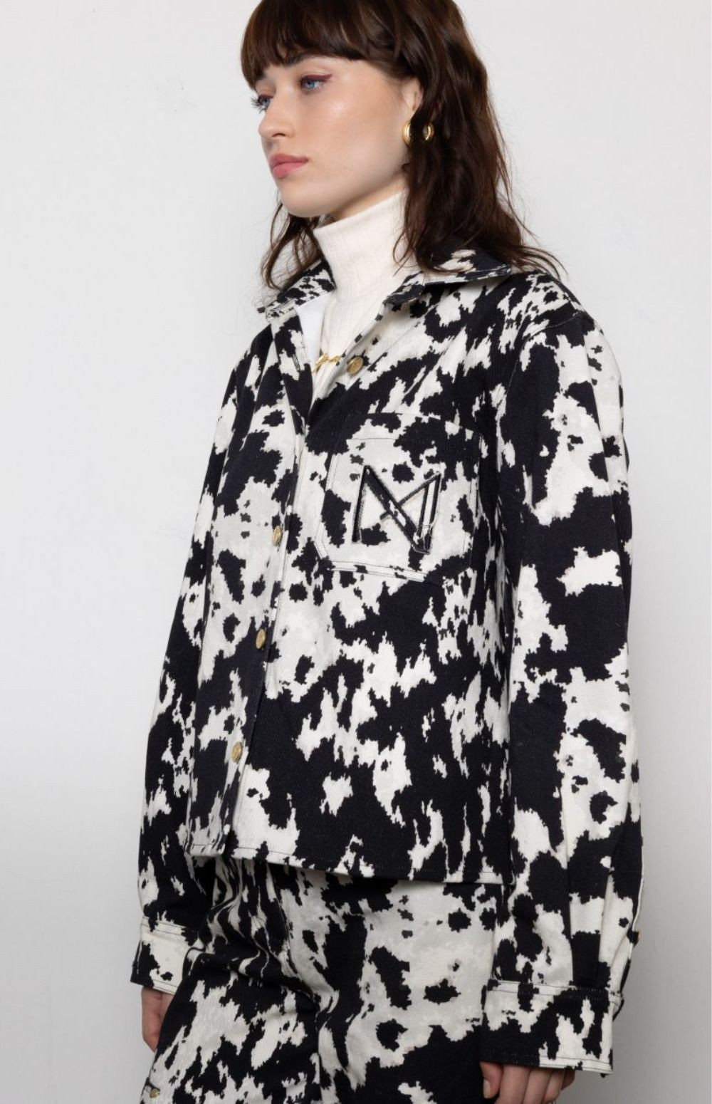 Boxy printed shirt jacket in abstract black and white print with gold buttons and embroidered “M” patch — bold, graphic, and effortlessly standout.