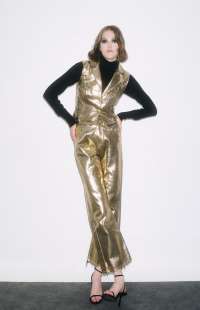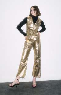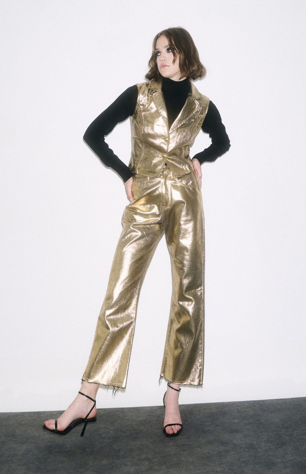 Introducing the "Gold Denim Trouser" by Combos Knitwear – a dazzling blend of comfort and glamour. Crafted from a lustrous gold material, these trousers feature a classic front button closure, straight leg cut, and convenient pockets, adding a touch of timeless elegance to any ensemble.