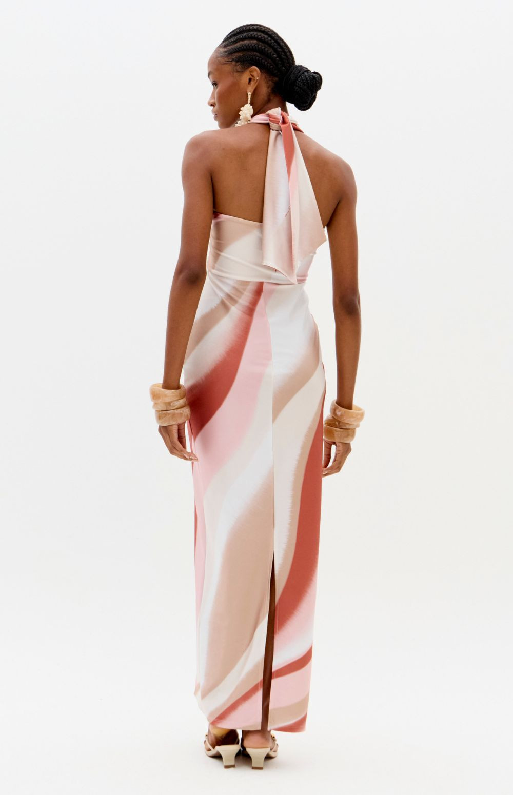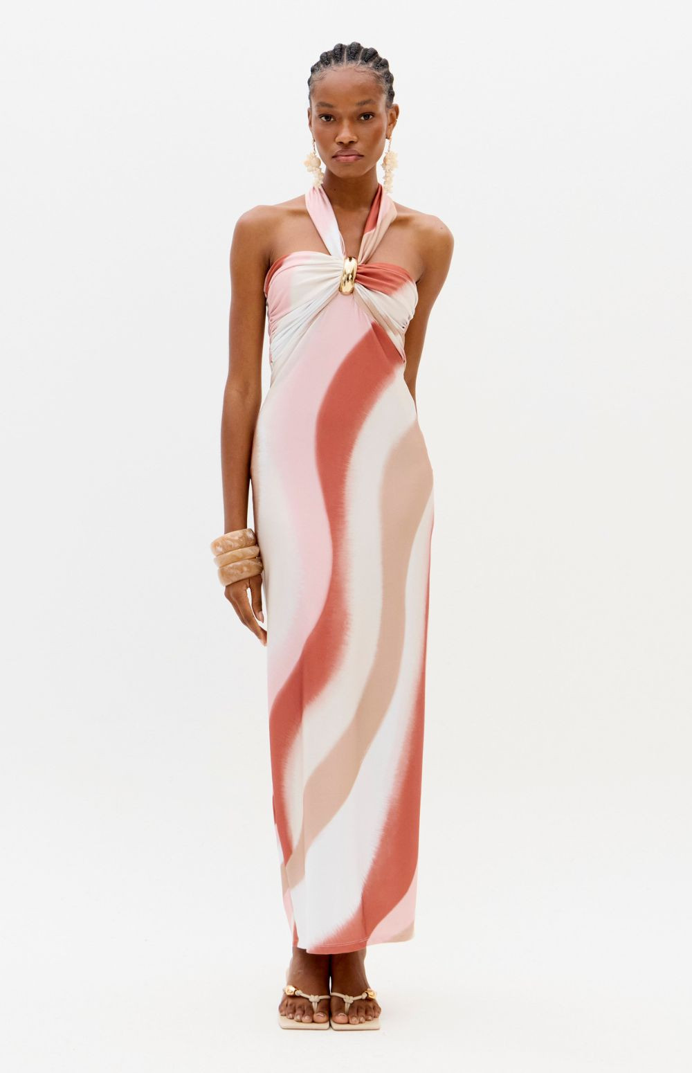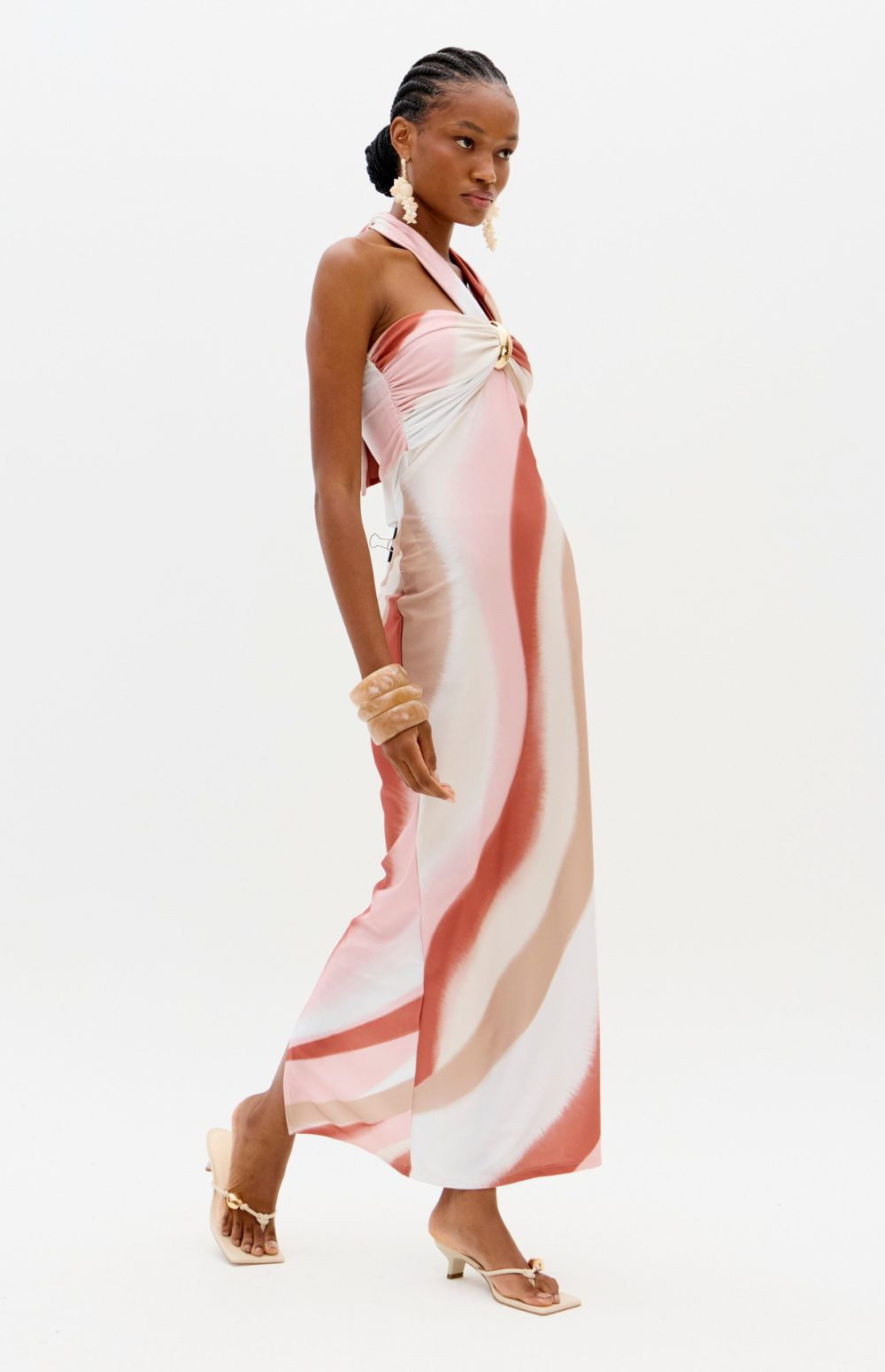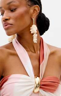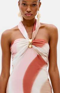 Features a gathered bust with a metal ornament detail for added sophistication.