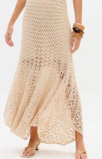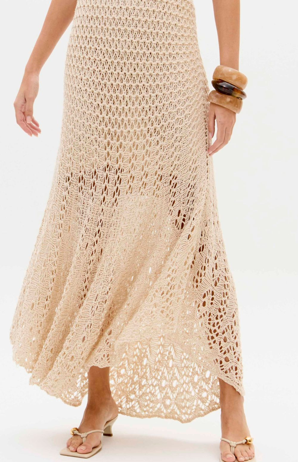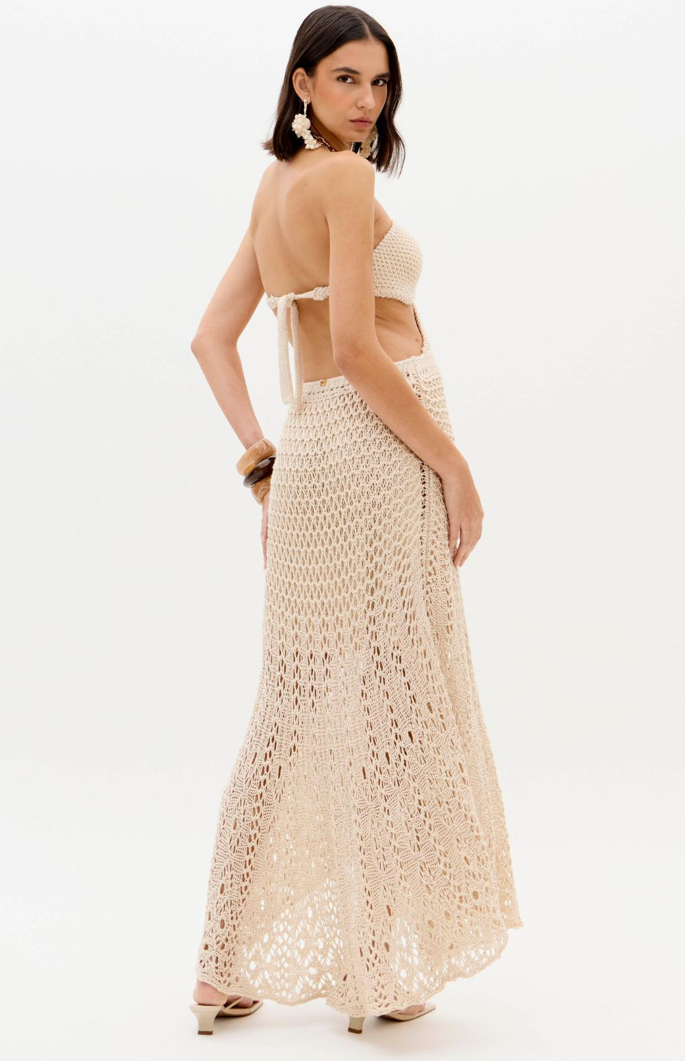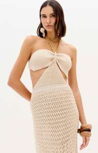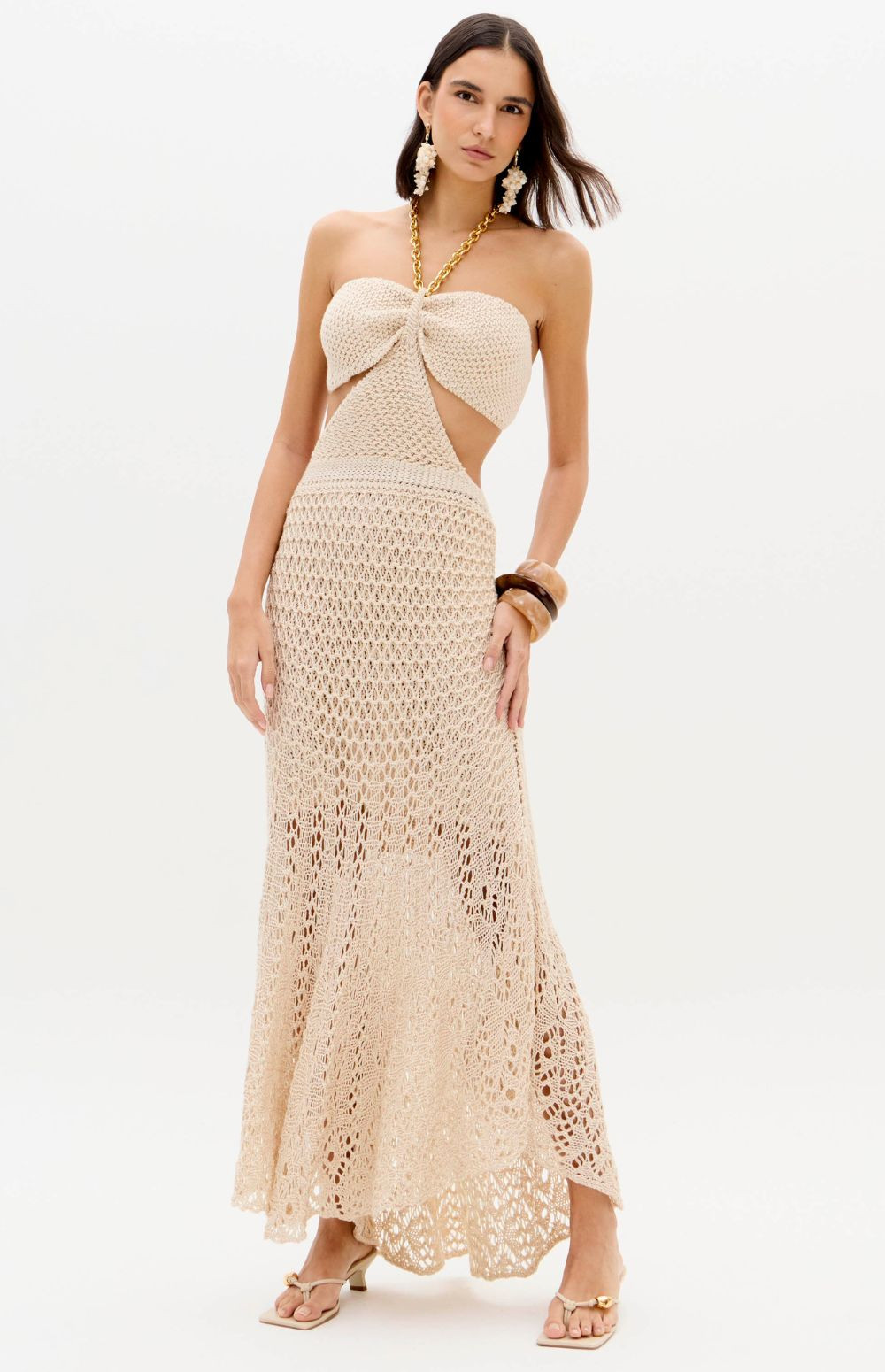 Maxi dress. It features a distinctive halter neck with a gold-tone chain detail, a keyhole cutout at the bust, and side waist cutouts. The dress is characterized by its open, crochet-style knit pattern that flows into a flared hem.