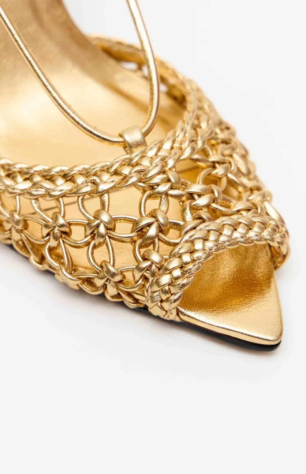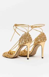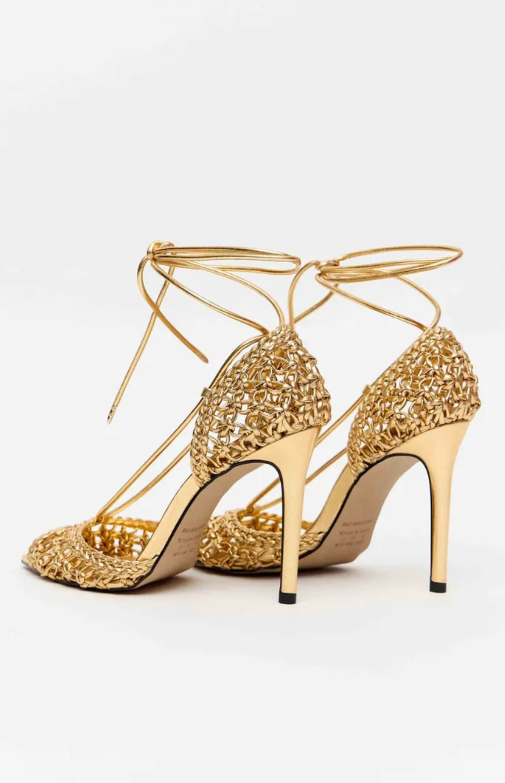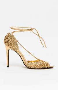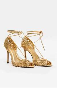 This stiletto sandal features delicate straps with a woven finish and a design that flatters the feet. The slightly pointed toe elongates the silhouette, while the ankle tie adds a stylish touch.