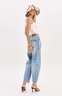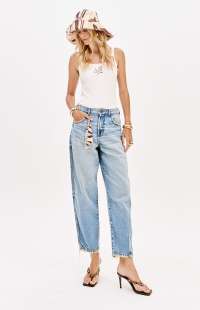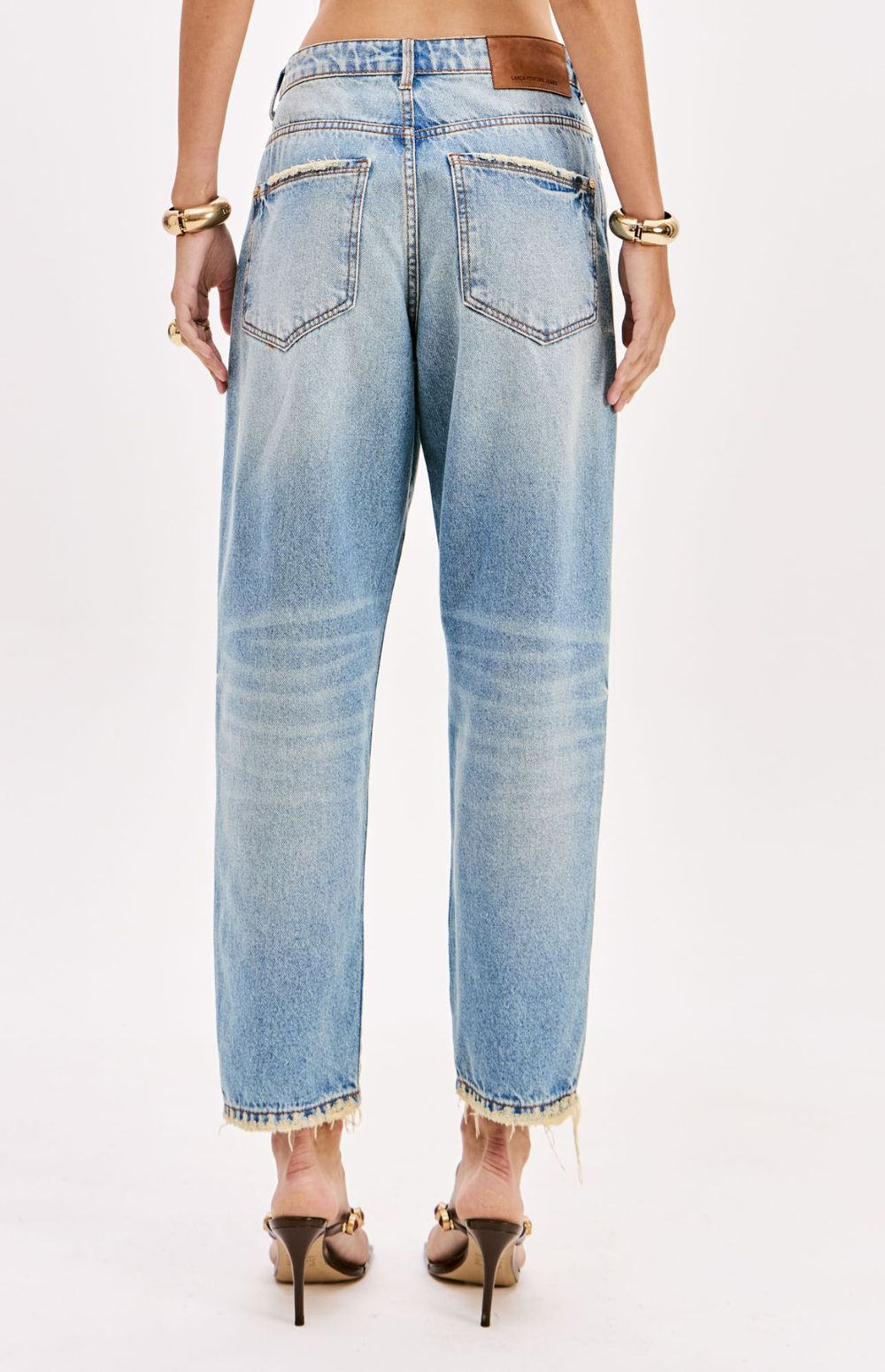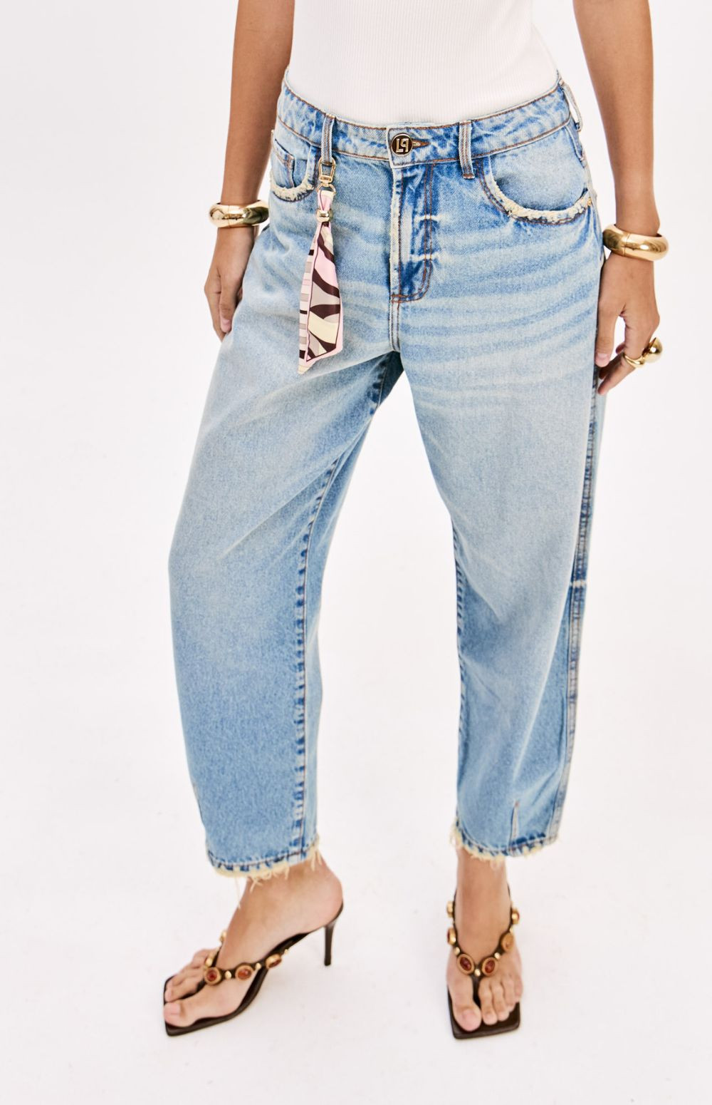 These baggy jeans feature a super high waist and a wide fit at the hips with a soft tapered hem. They have functional pockets, a button and zipper closure, and a keychain with a printed scarf that adds a stylish touch. Invest in them!