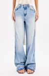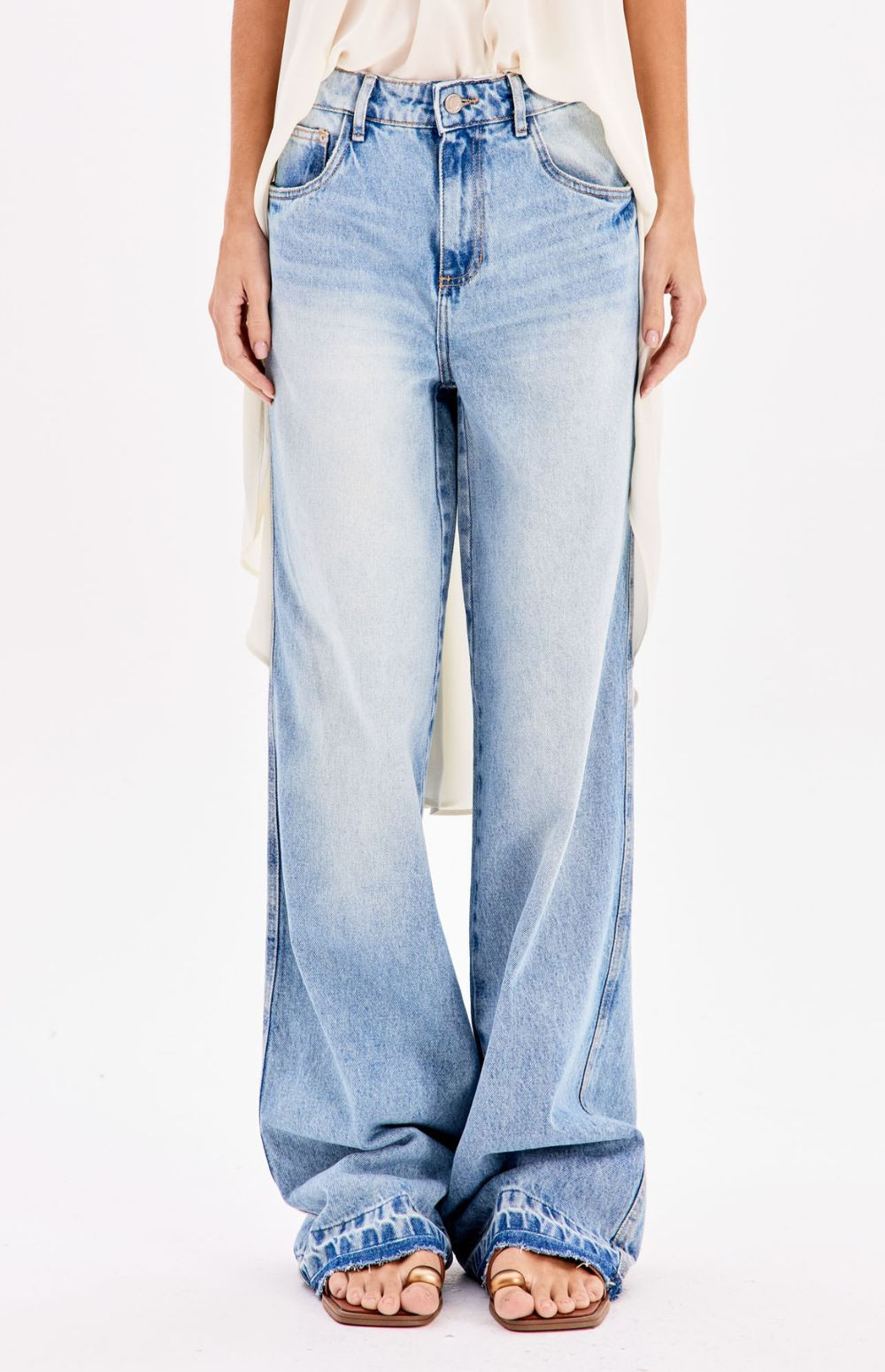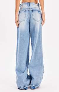 The fashionable and laid-back detail comes from the extra-long, frayed or unraveled hem, designed to be worn tucked into shoes. The light wash with subtle natural distressing makes it a versatile and trendy piece.
