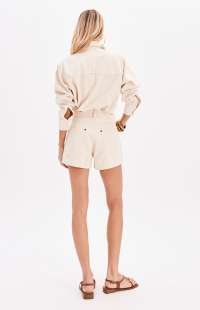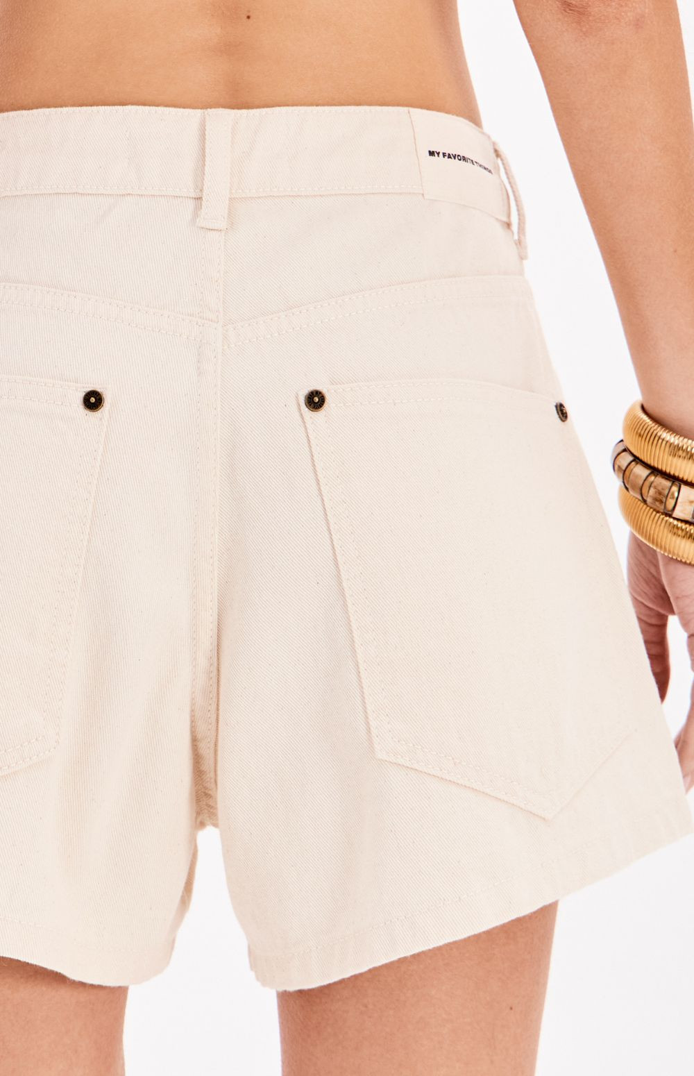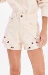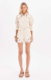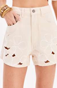 These twill shorts feature a comfortable fit and a high waist. They have functional front and back pockets, a waistband with belt loops, and a button and zipper closure. The highlight is the floral embroidery with cutouts, which add texture and lightness to the garment.