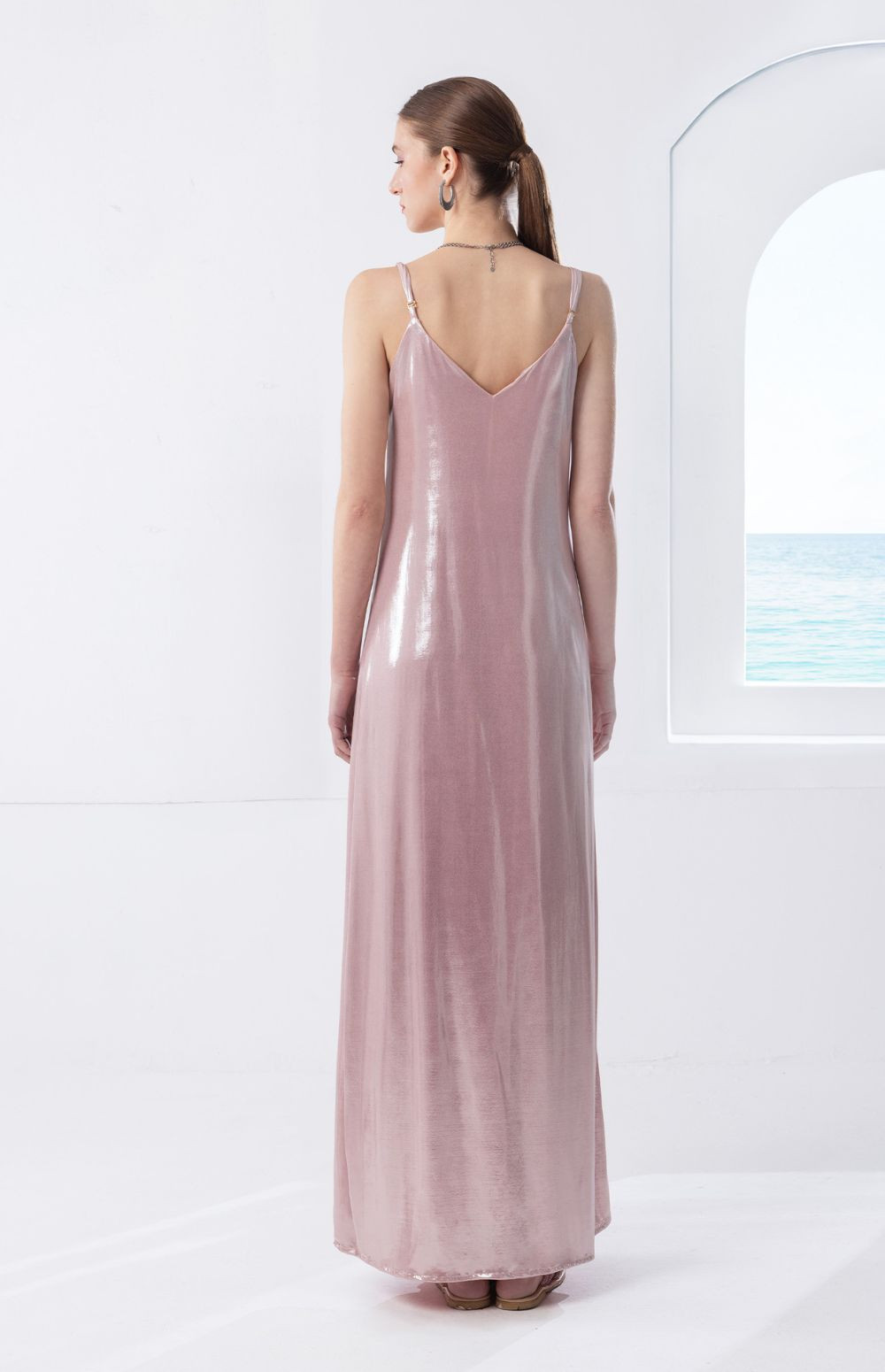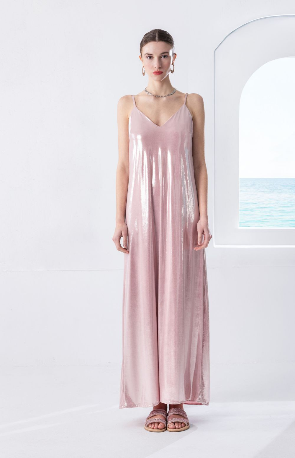 Maxi dress in a metallic blush pink shade with a subtle luminous finish that catches the light beautifully. Designed with delicate straps and a V neckline, its relaxed flowing silhouette offers effortless elegance and comfort.