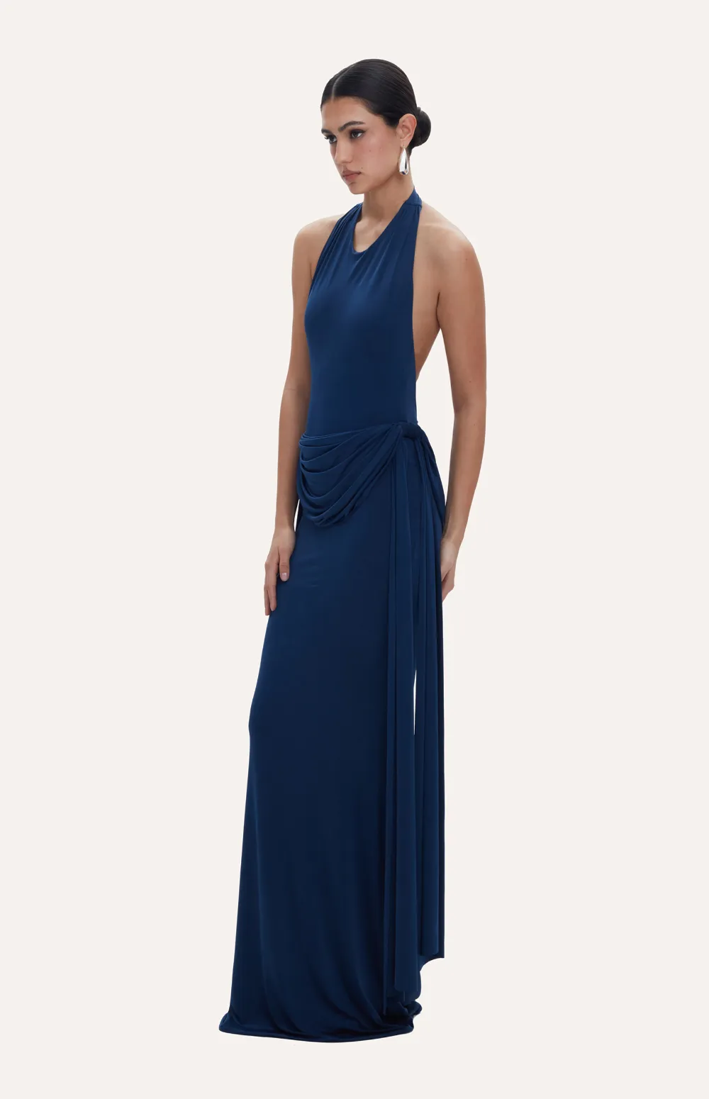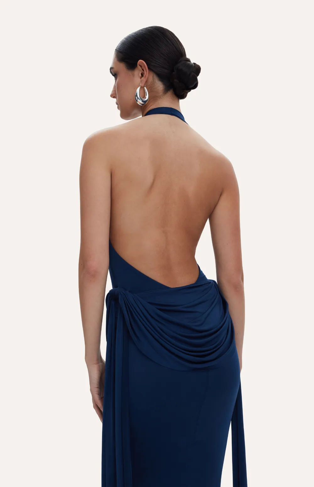 This maxi dress features a mermaid hem and a signature draped nautilus belt that cinches the waist with grace.The open back delivers a striking contrast to the dress’s graceful lines. Designed for a flawless fit and effortless movement.