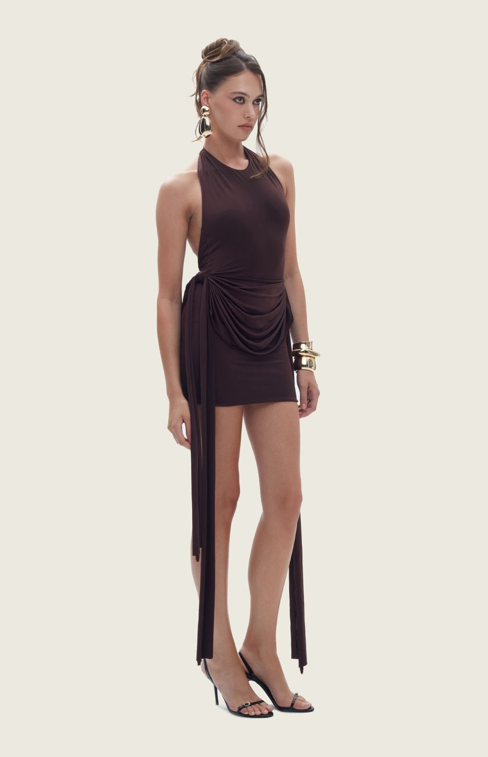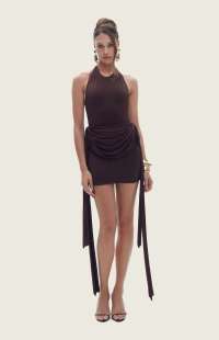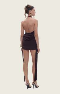 Make a statement with this striking halter neck mini dress, designed to exude modern sophistication. Crafted from soft, stretchy jersey fabric, it offers a sleek, body contouring fit that flatters every shape. The draped panel detail at the waist and hips creates an elegant, sculptural effect while elongating the silhouette. Perfect for cocktail nights or special occasions, this piece blends minimal design with bold femininity.