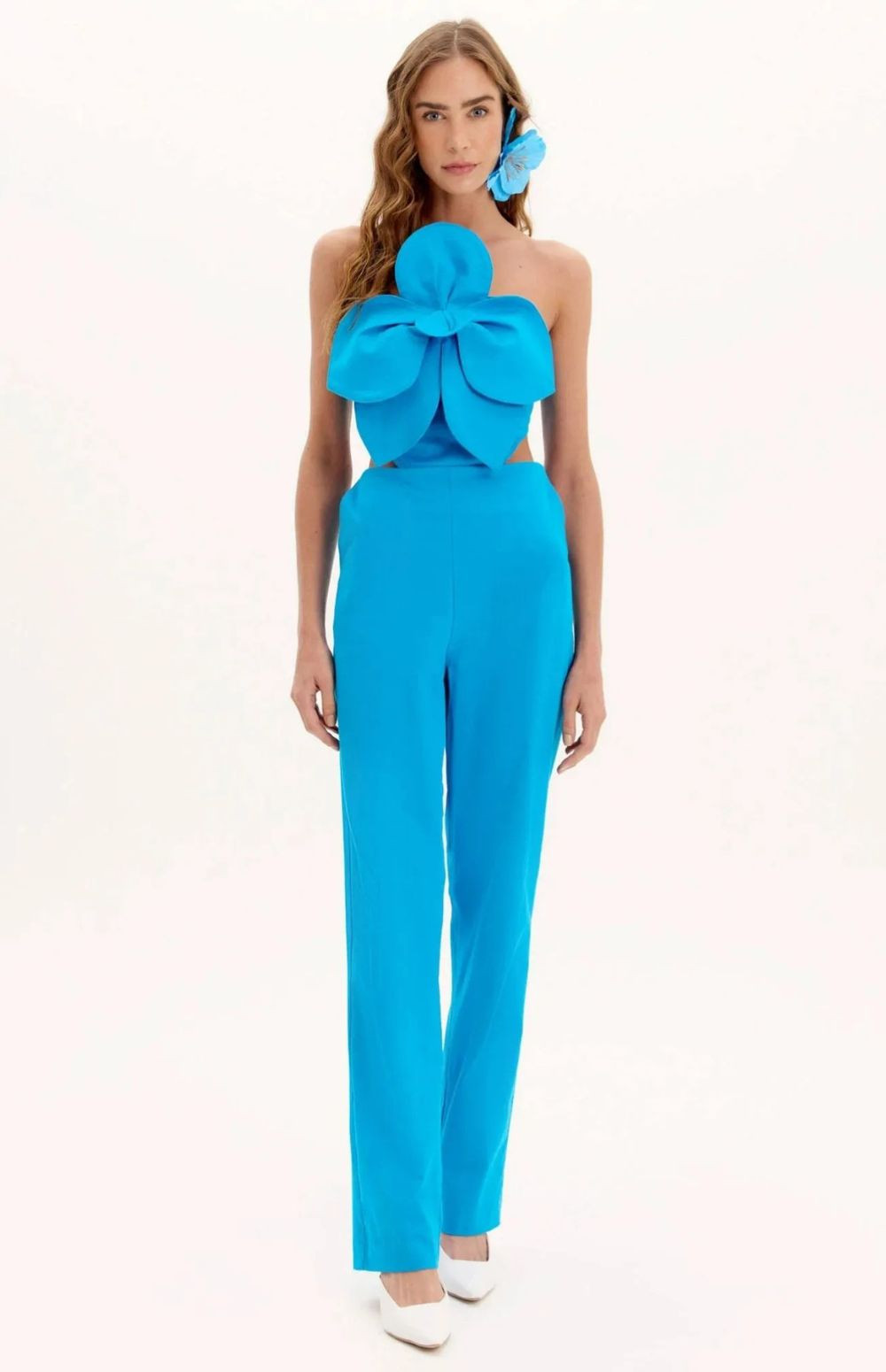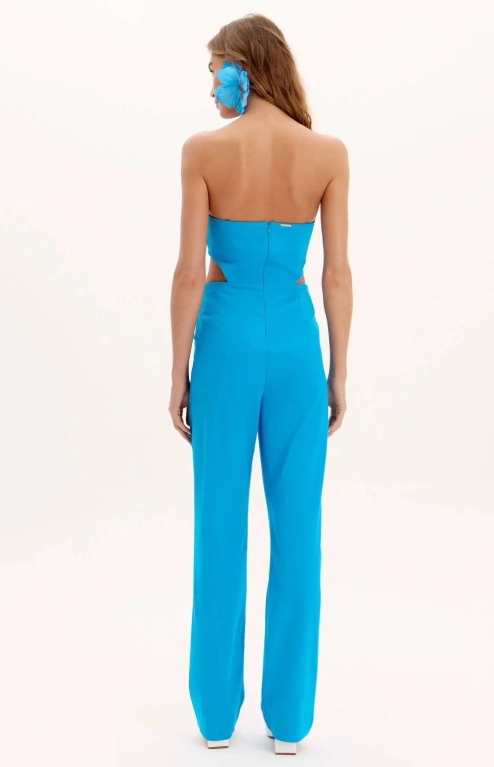 Features: Includes side cutouts at the waist and straight-leg trousers designed to elongate the silhouette
