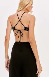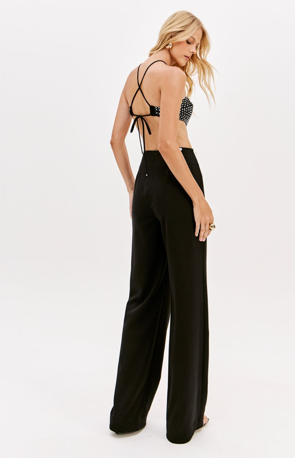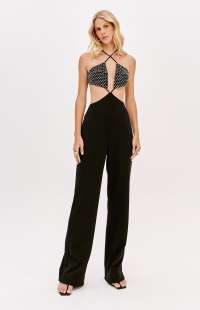 This long jumpsuit combines elegance and boldness with its bust adorned with sparkles and side cutouts. Made from a structured tailoring fabric, it features a back zipper closure and delicate tie detail. Go for it and shine on evening occasions!