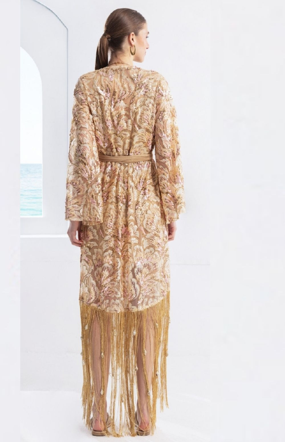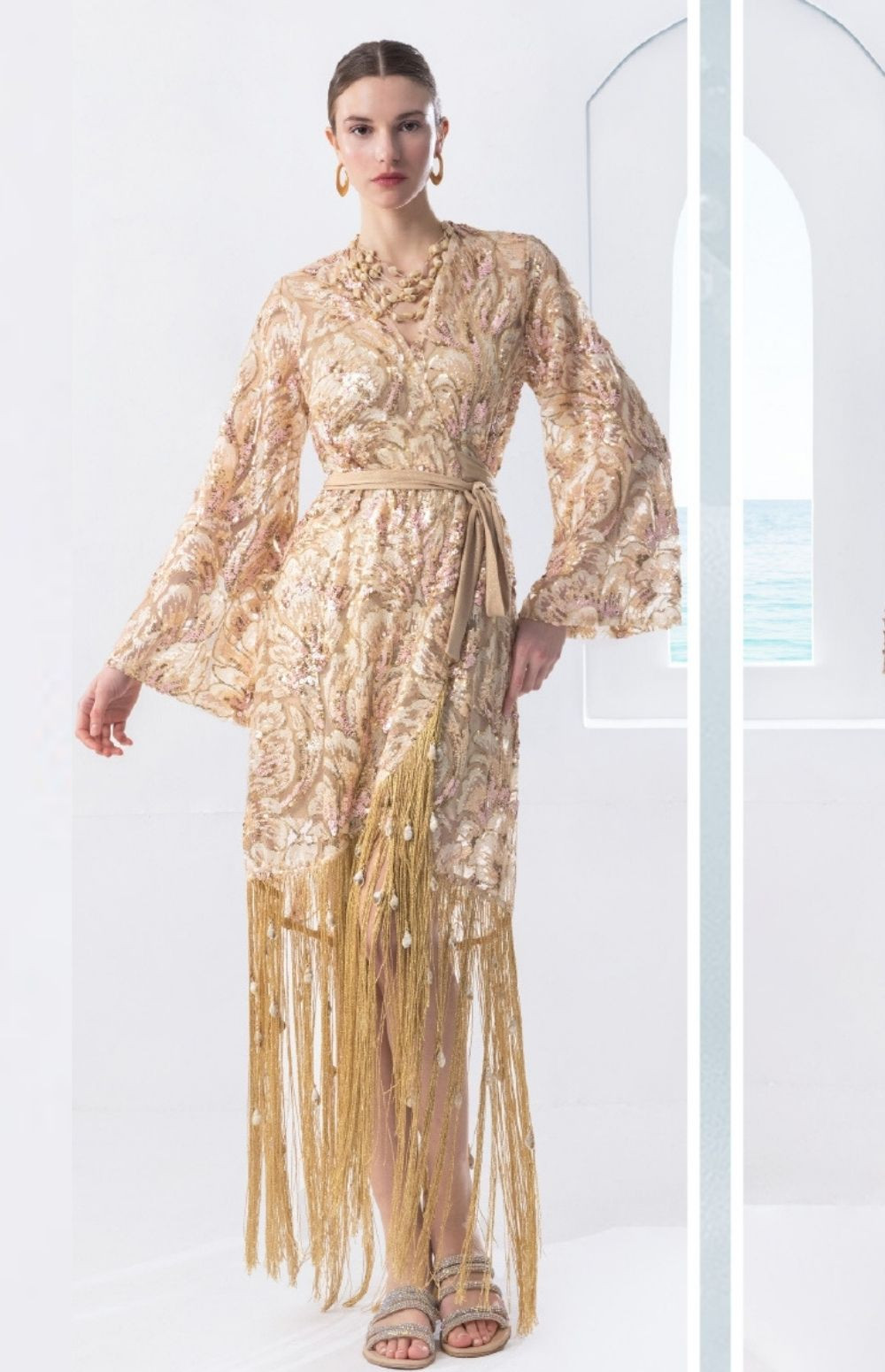 Sequin kimono dress with fringes decorated with shells