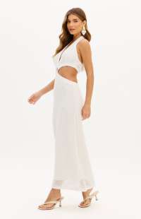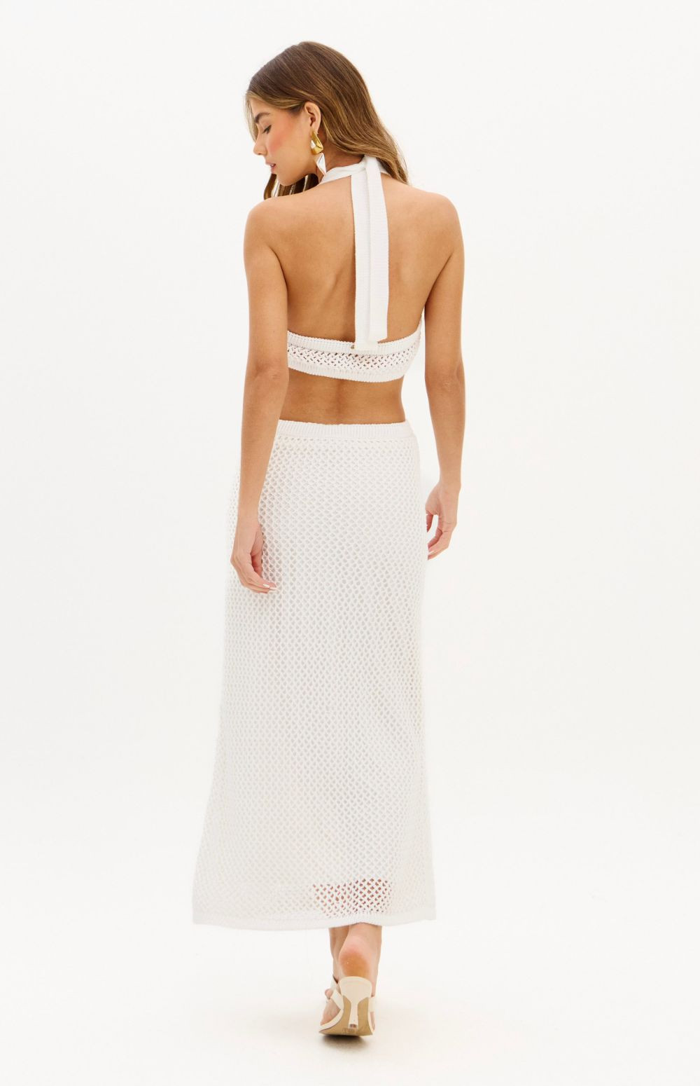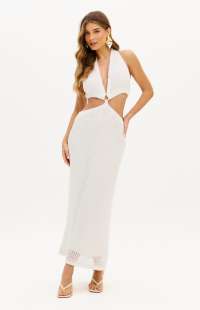 Cool minimalism with a handcrafted vibe. This super midi knit dress features a halter neck design, cut-out details, and a drape that flatters the body with lightness and naturalness, perfect for summer days.
