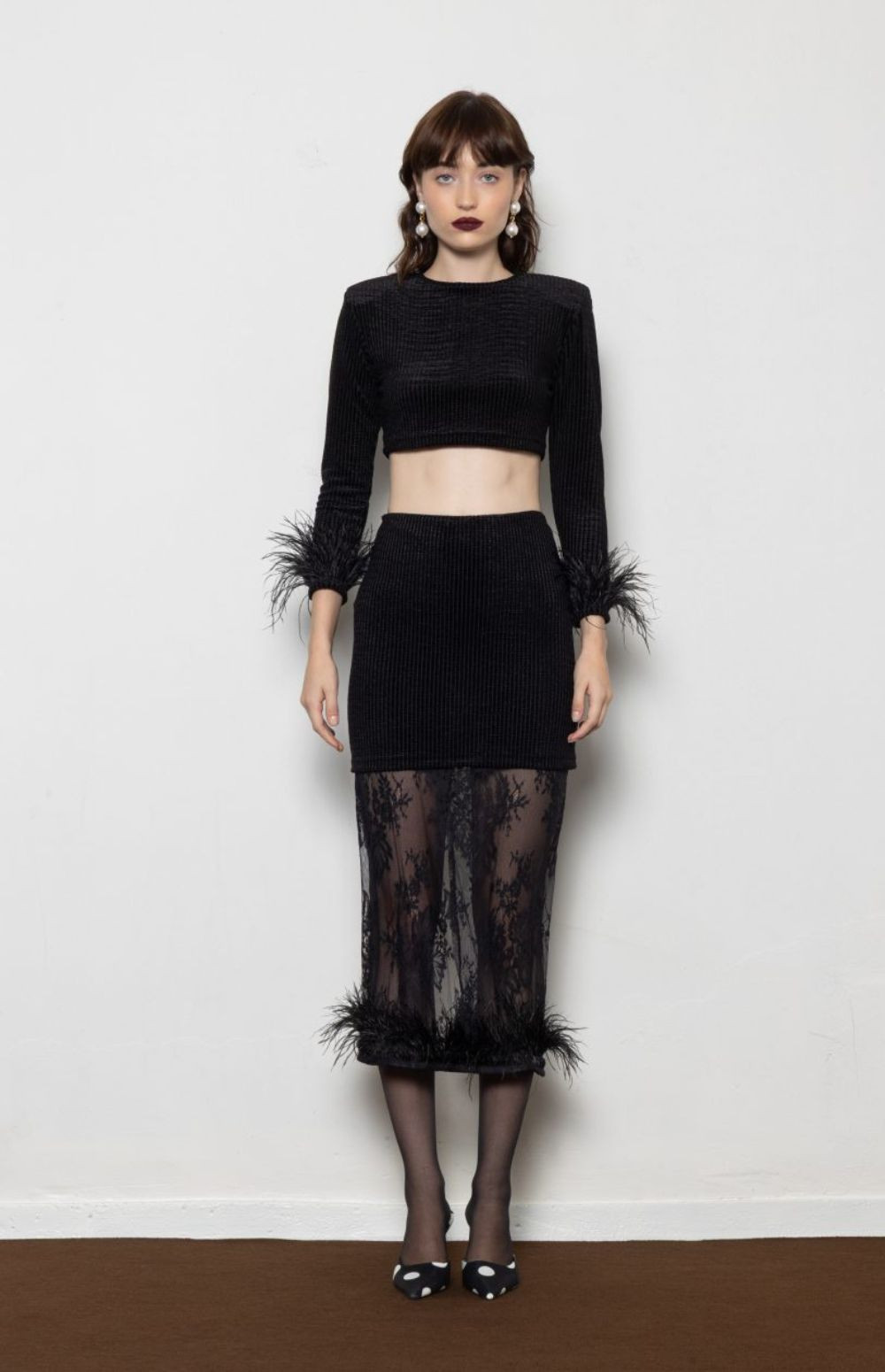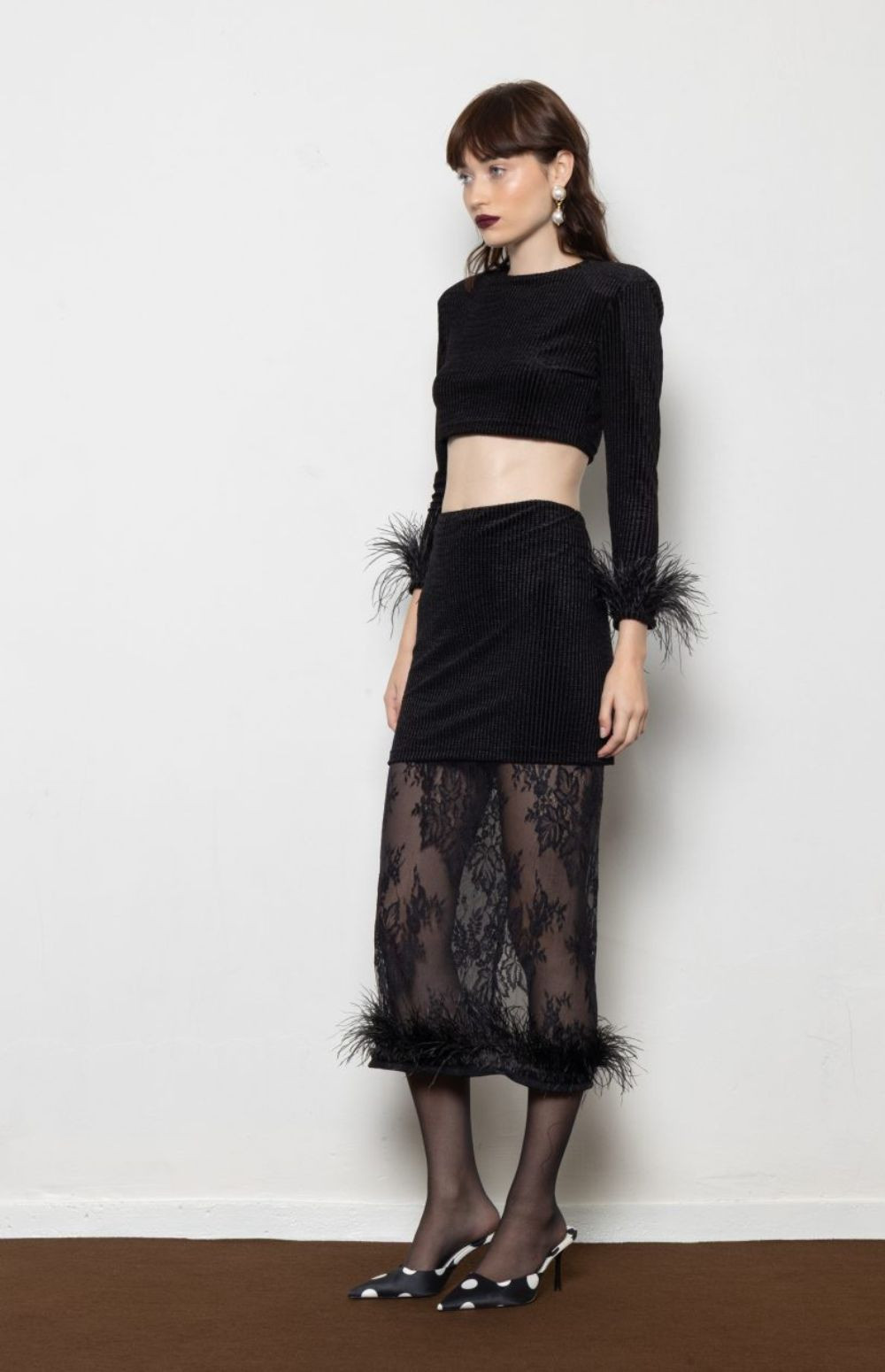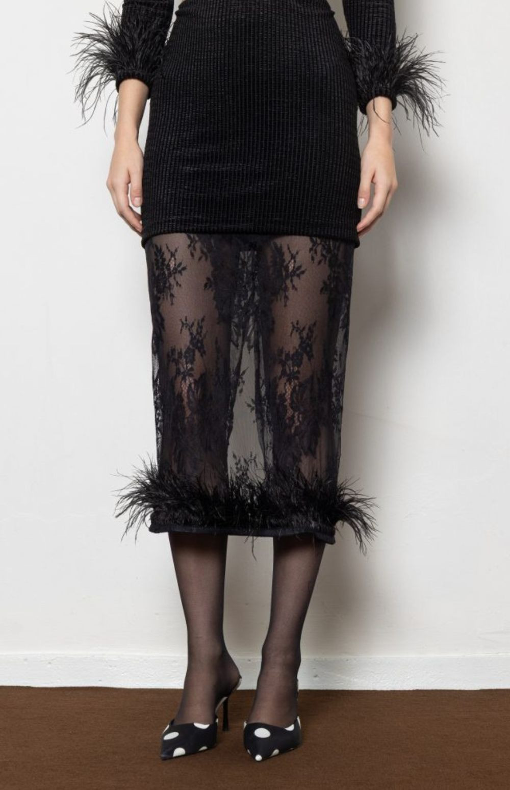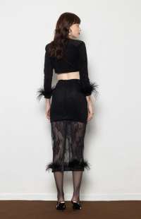 Sheer seduction. This black velvet and lace skirt features a figure-hugging silhouette and feather-trimmed hem — a bold blend of texture and allure