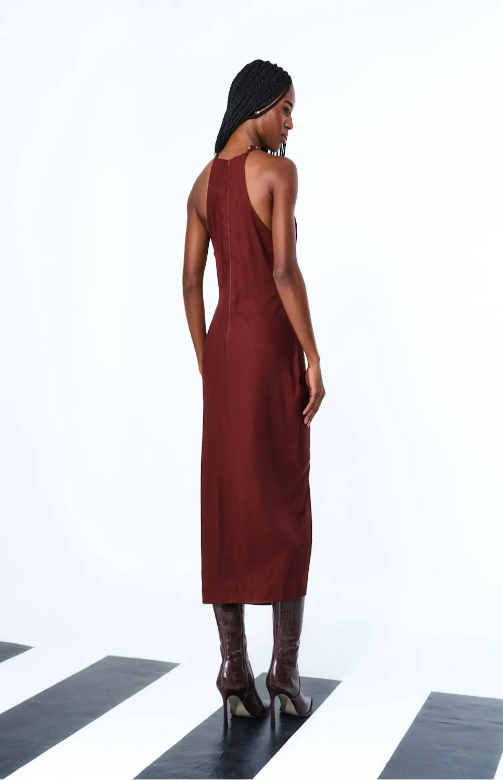 Linen dress with combined with the powerful metal detail, which breaks the mold in a super chic way.