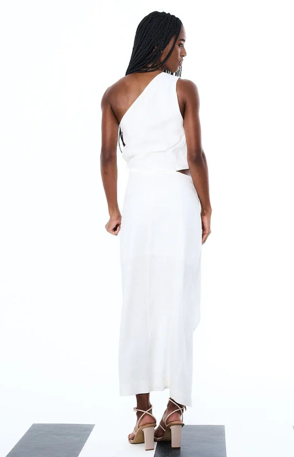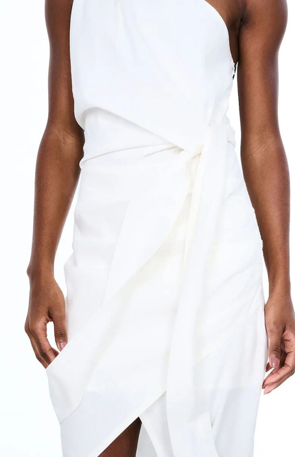 The dress is a one-shoulder design with a draped, wrap-style skirt and a high slit.
