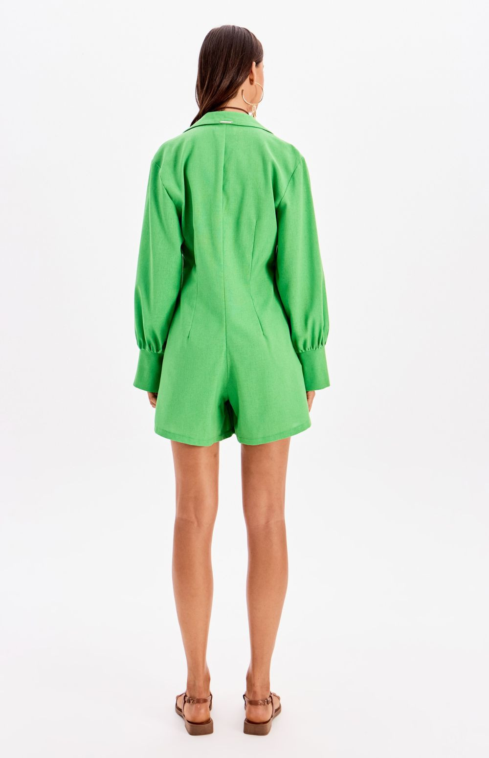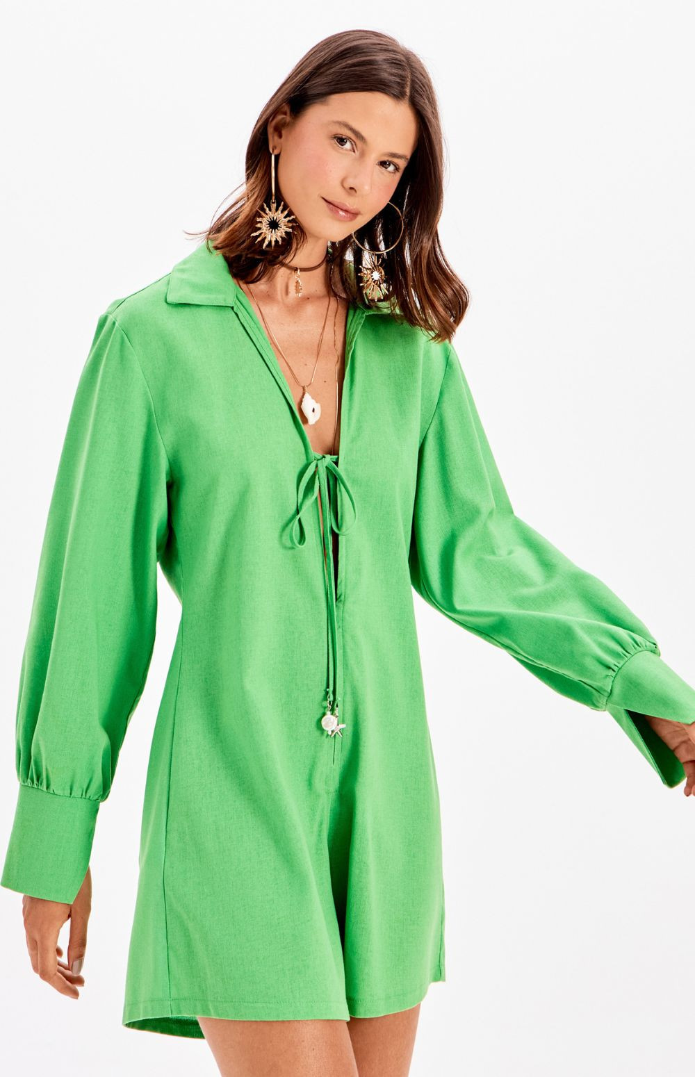 With a relaxed fit that flatters the figure, this linen playsuit exudes freshness and style. The delicate tie-up neckline and wide long sleeves create a perfect balance between casual and classic.