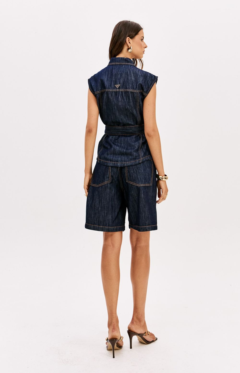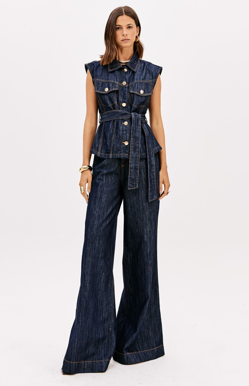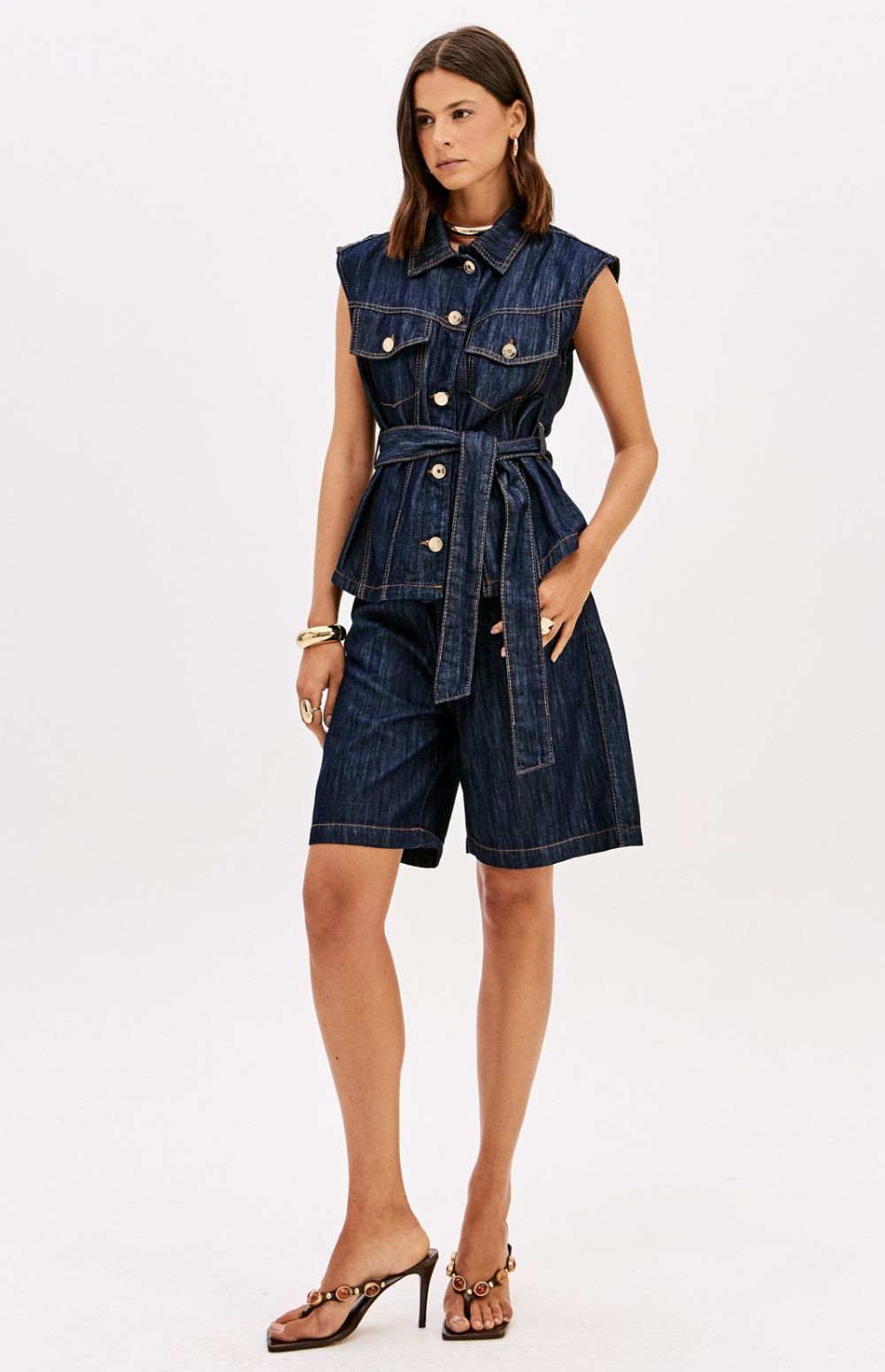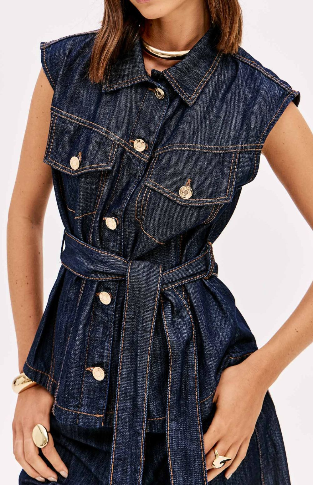 Versatile, this denim vest features a longer silhouette, a traditional collar, and a button-front closure. It comes with a waistband for adjustment and decorative pockets with flaps that elevate the look. Invest in this unique piece!