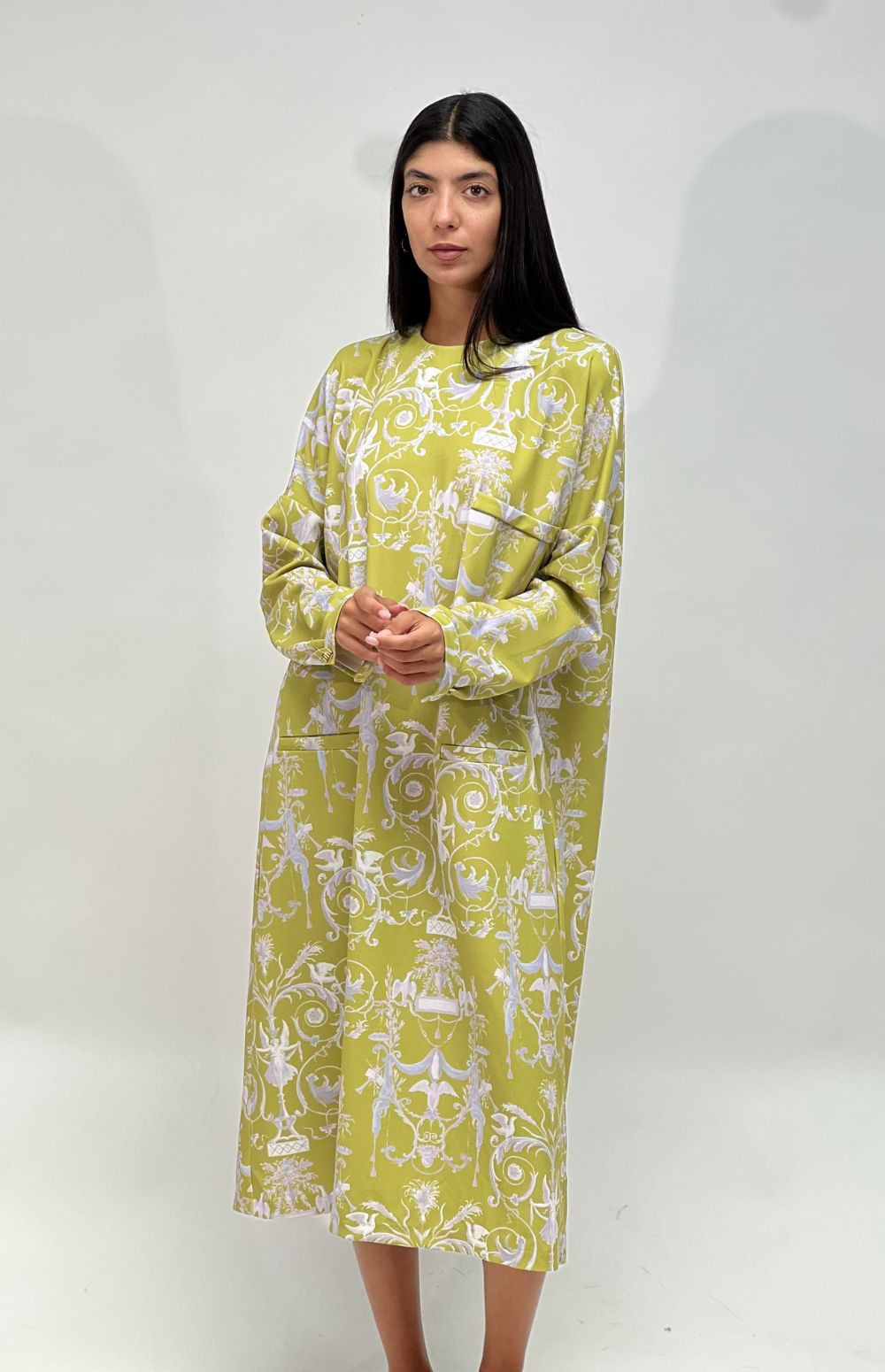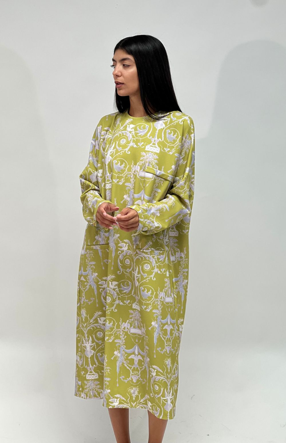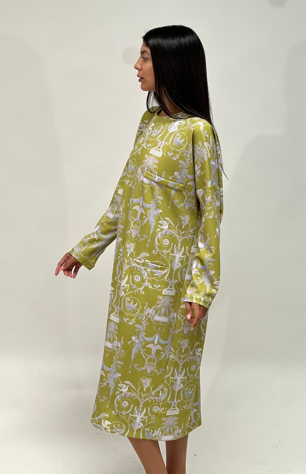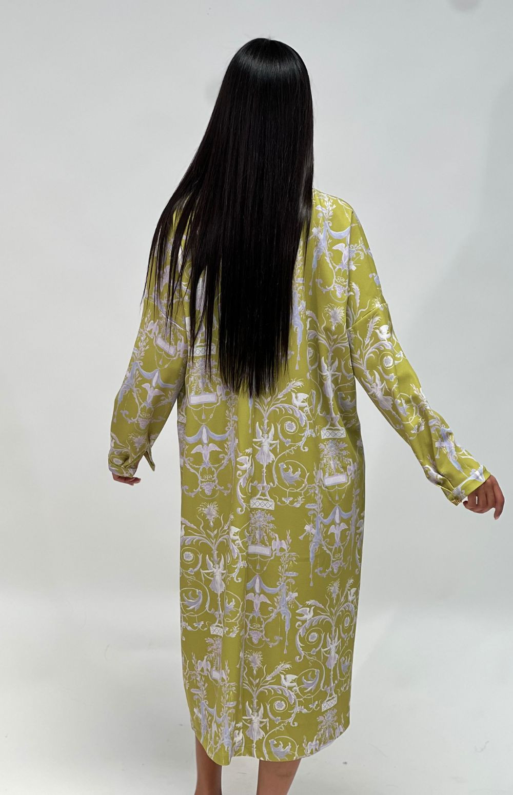Embrace elegance in this flowing, long-sleeved, oversized dress, featuring side pockets, a graceful back closure secured by milkwhite buttons and a charming print with angels in a lime color.