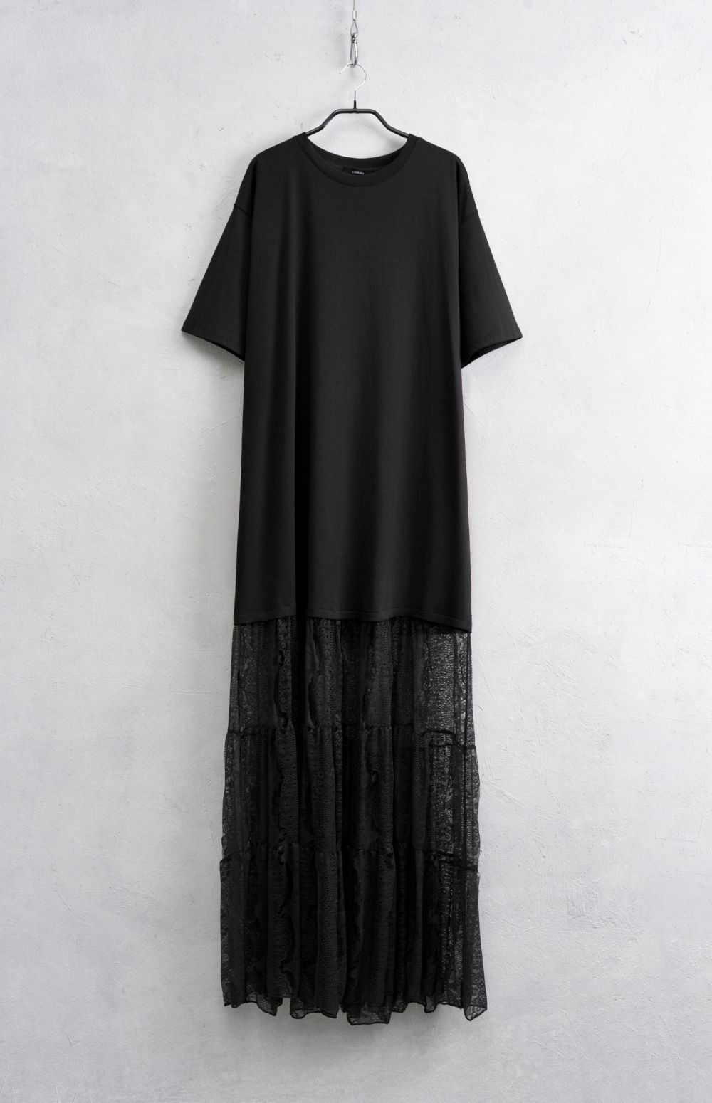 Long dress with round neck and short sleeves. Contrasting combined fabric detail at the bottom. Soft fit, available in one size.