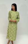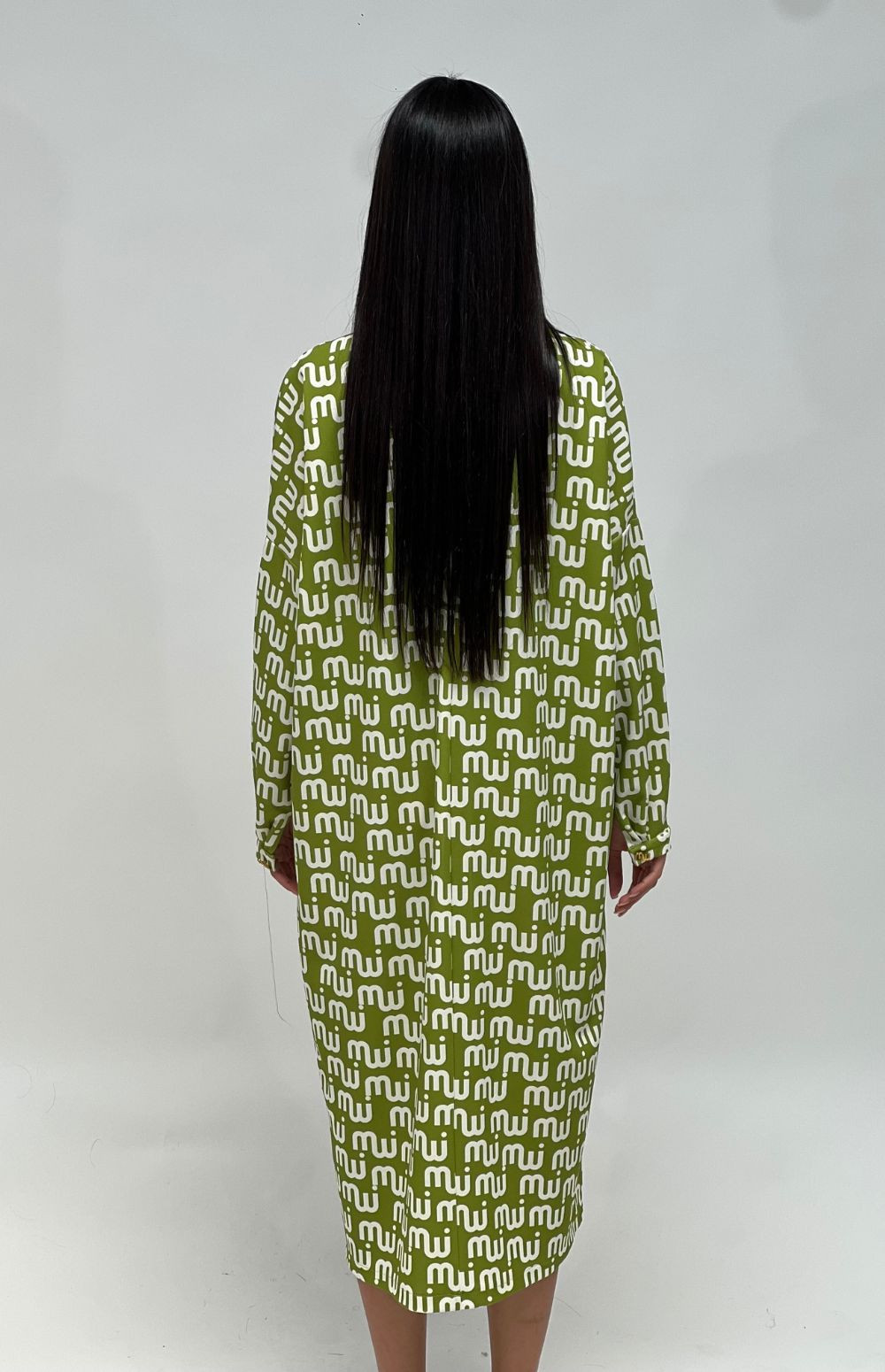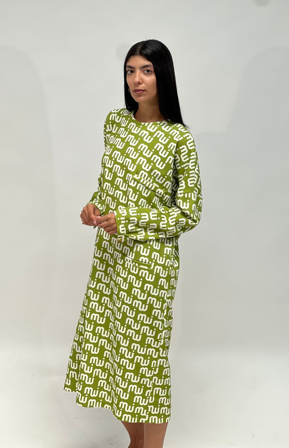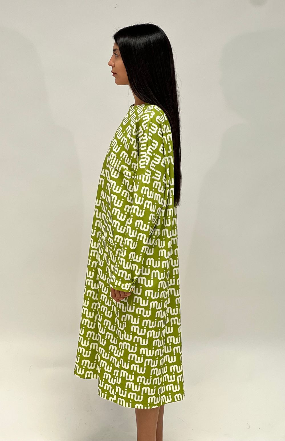 Embrace elegance in this flowing, long-sleeved, oversized dress, featuring side pockets and a charming milkwhite monogram logo. Available in two colors, green with white lettering, and rich reddish brown with light blue lettering.