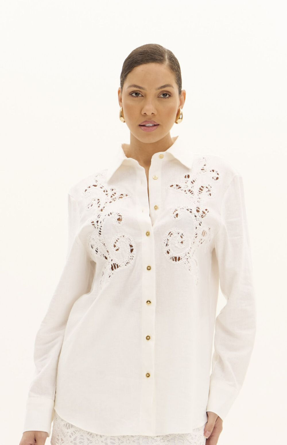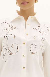 Designed for a modern, relaxed silhouette, the shirt features dropped shoulders and side slits for effortless movement. The delicate openwork detailing on the chest and sleeves offers a feminine touch, making it a versatile piece that transitions seamlessly from polished office wear to a refined weekend look.