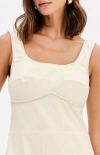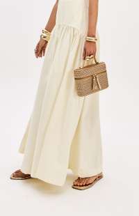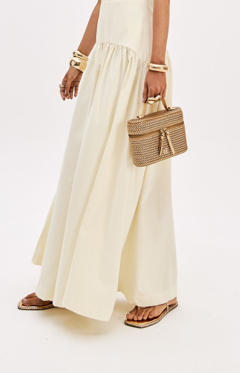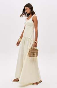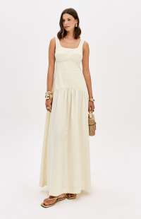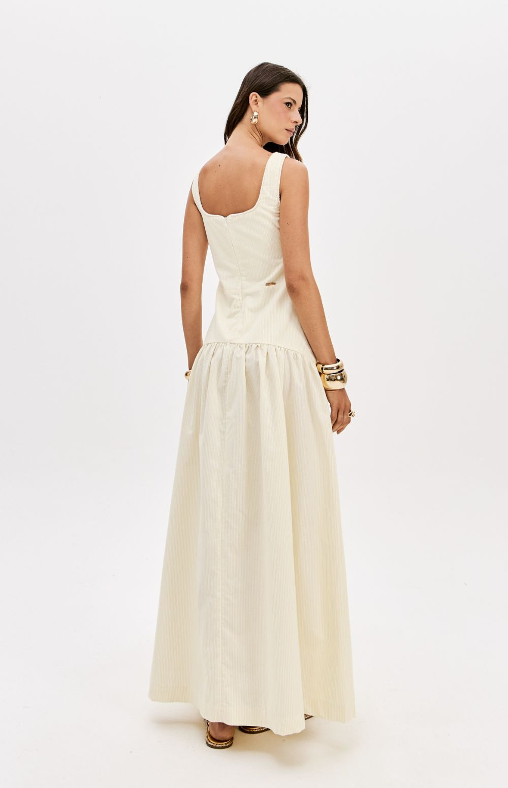 Made from a structured, non-stretch fabric, this super midi dress with straps features a square neckline, back zipper, and a fitted bust with cutouts. Its wide skirt with gathers adds movement and lightness to the look.