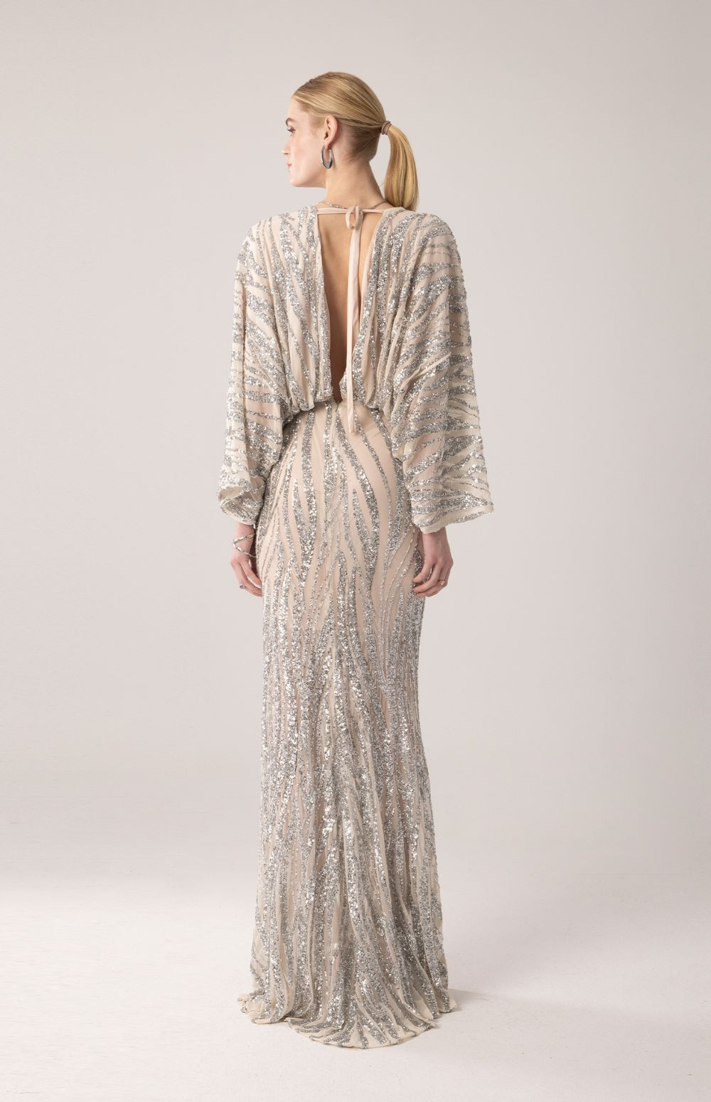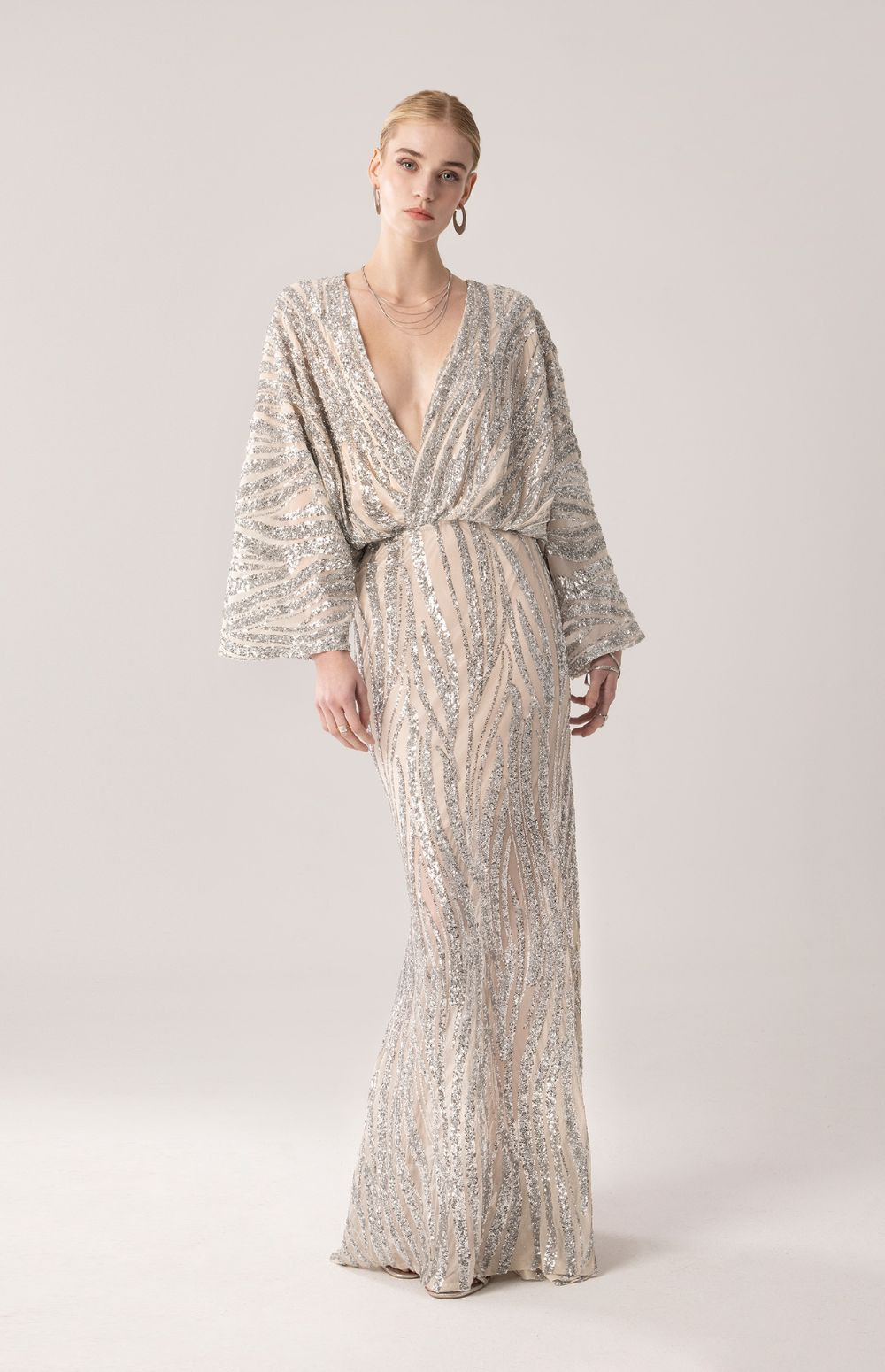 Maxi dress in a nude base adorned with striking silver sequin detailing that creates a flowing, luminous pattern. Designed with a deep V neckline and wide kimono-style sleeves for an elegant, fluid silhouette. The waist is softly defined, while the back features a deep V opening with a delicate neck tie closure. Perfect for formal occasions, galas and evening events.