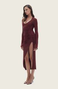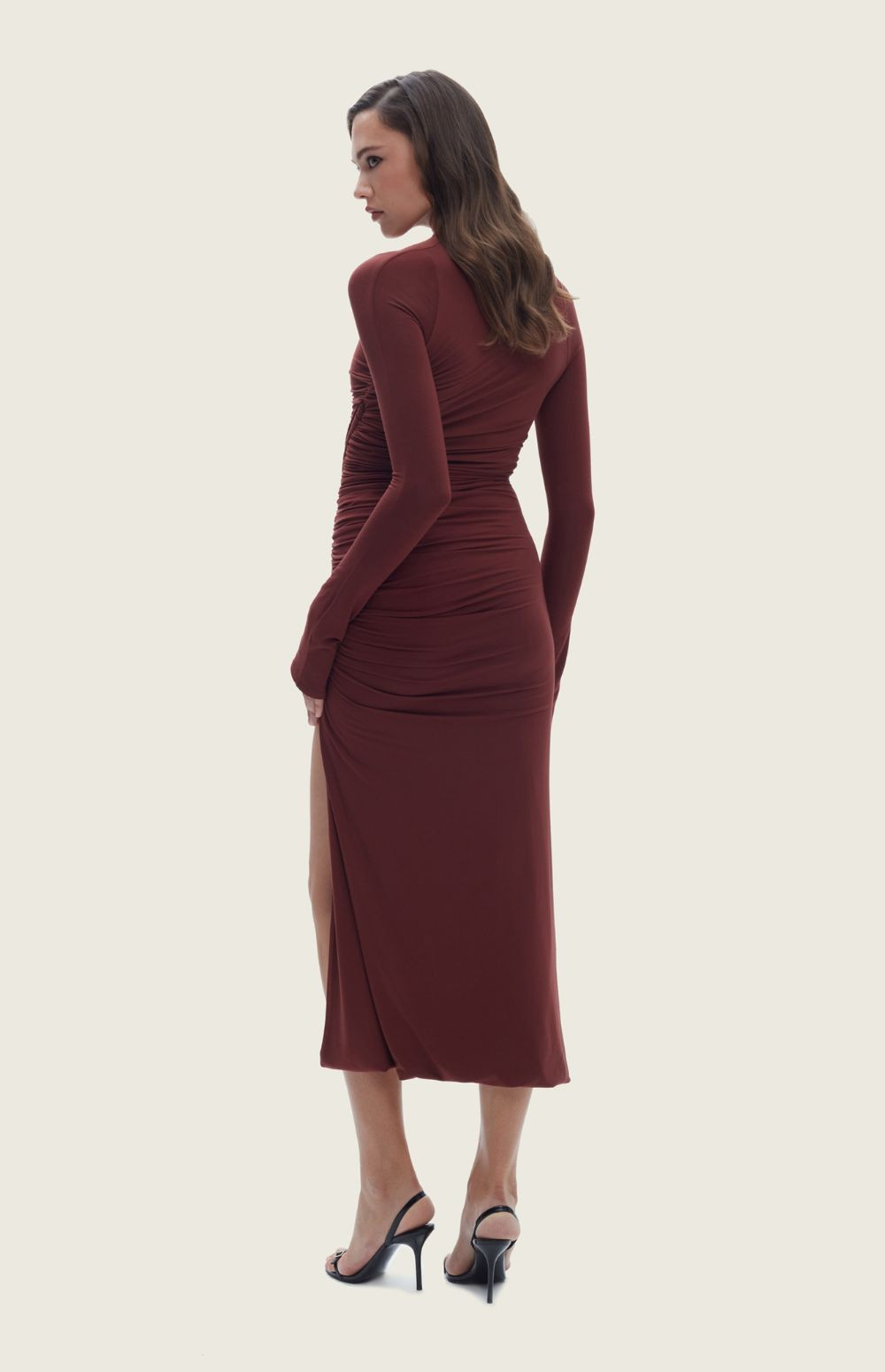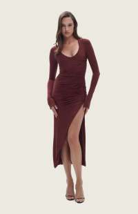 Elevate your evening look with this sculptural bamboo jersey dress, designed to flatter every curve with its soft, stretchy fabric and refined drape. The asymmetric silhouette creates a modern, artful flow, while the scoop neckline and long fitted sleeves strike the perfect balance between allure and sophistication.