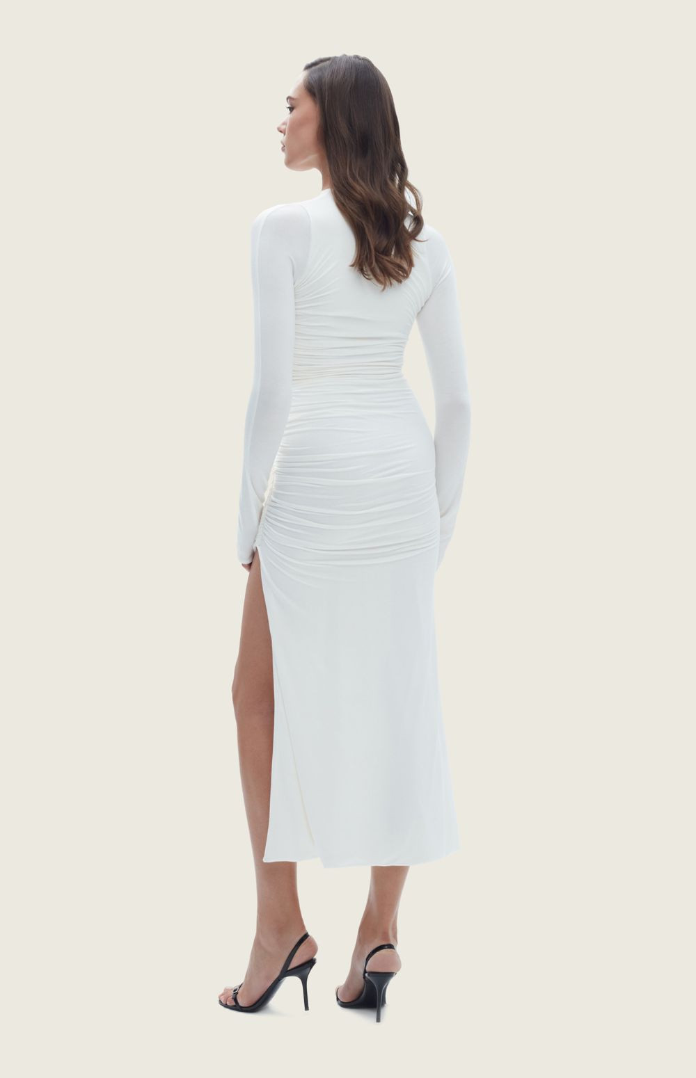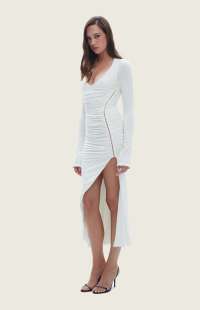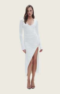 Elevate your evening look with this sculptural bamboo jersey dress, designed to flatter every curve with its soft, stretchy fabric and refined drape. The asymmetric silhouette creates a modern, artful flow, while the scoop neckline and long fitted sleeves strike the perfect balance between allure and sophistication.
