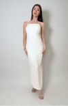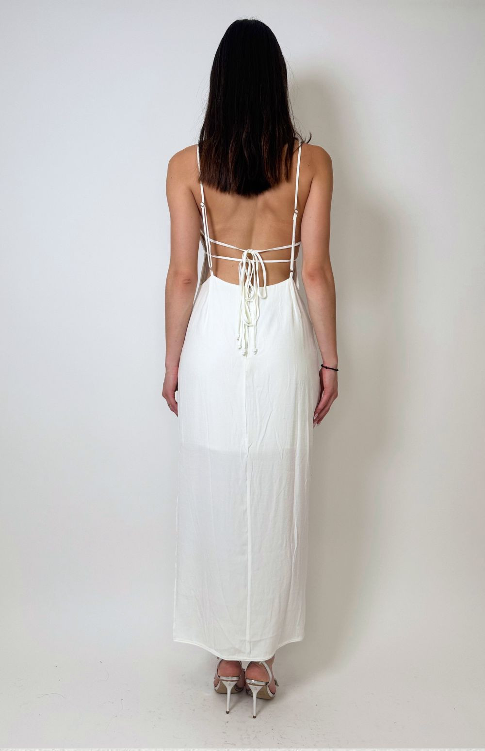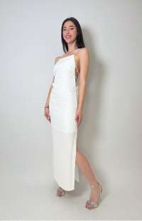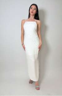 Dress: Midi model, racerback neckline, flowing fabric, side detailing with rhinestones, side slit, impeccable fit.