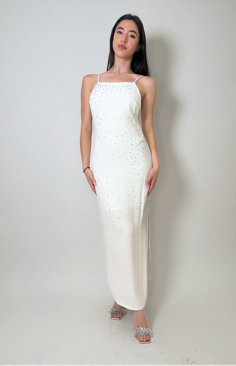 Details: The delicate rhinestones add a touch of shine and sophistication, without being exaggerated. The minimalist design and straight cut enhance the piece and its impeccable fit. The side slit guarantees a touch of sensuality and practicality.