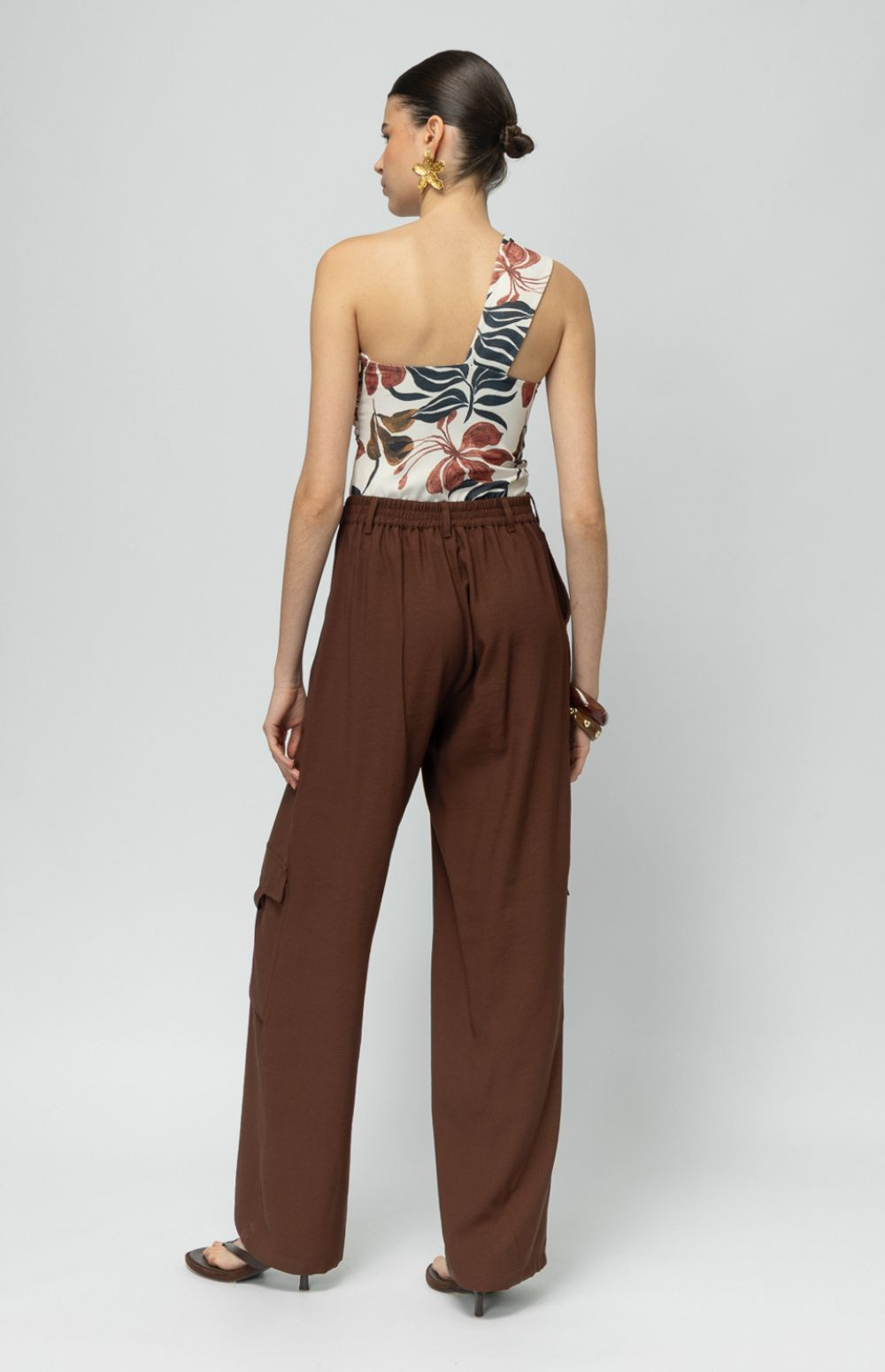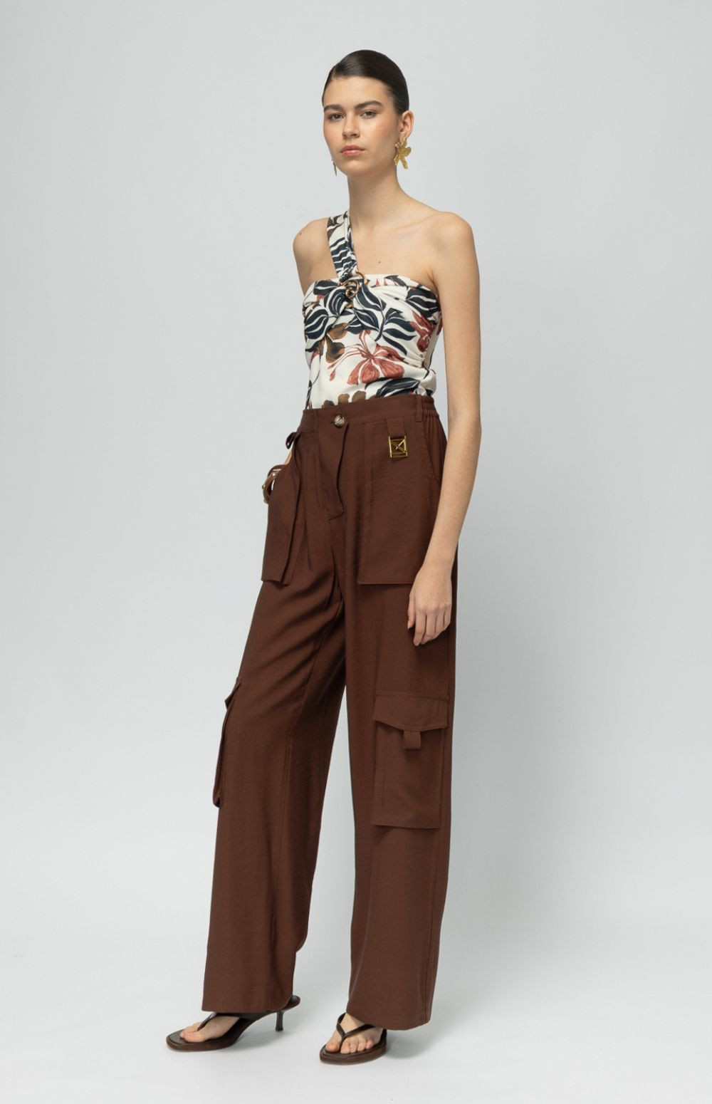 Tailored cargo trousers in rich brown, finished with statement pockets and a subtle gold accent
