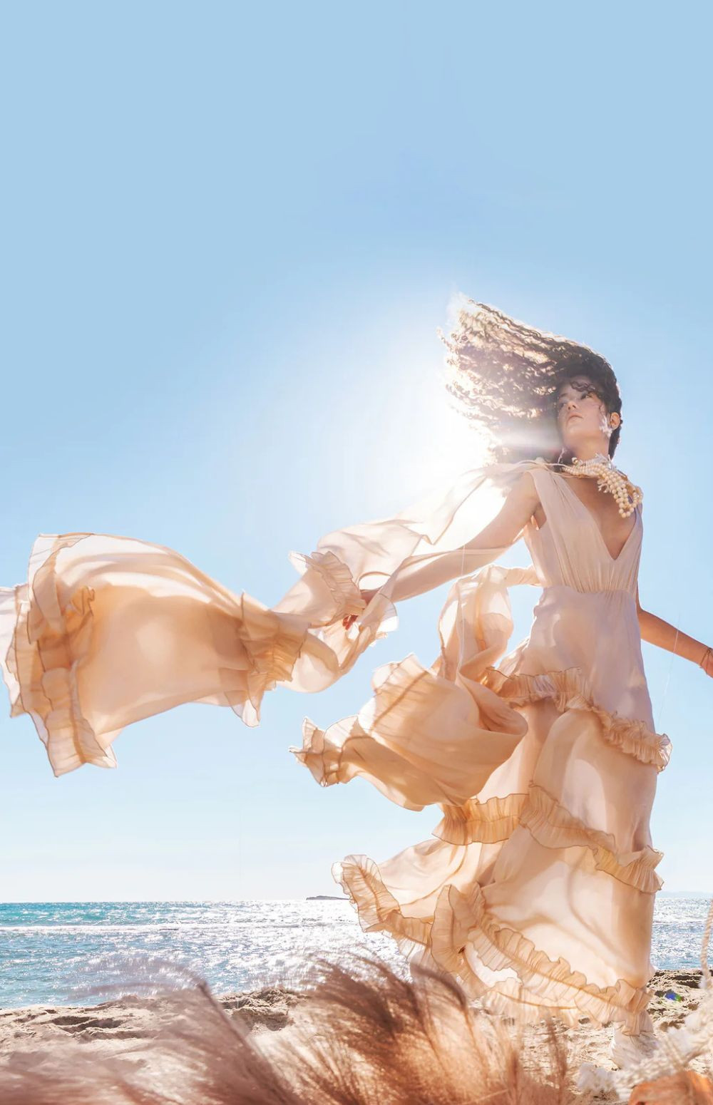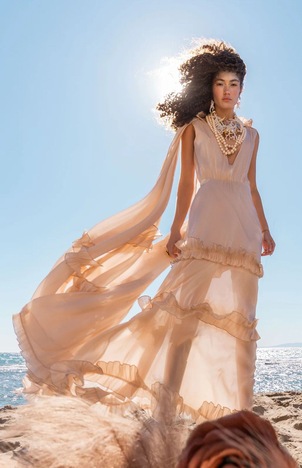 Maxi dress in a soft nude-peach shade with airy movement and a romantic aesthetic. It features a deep V neckline with a delicate neck tie and an elasticated waist that enhances the silhouette.