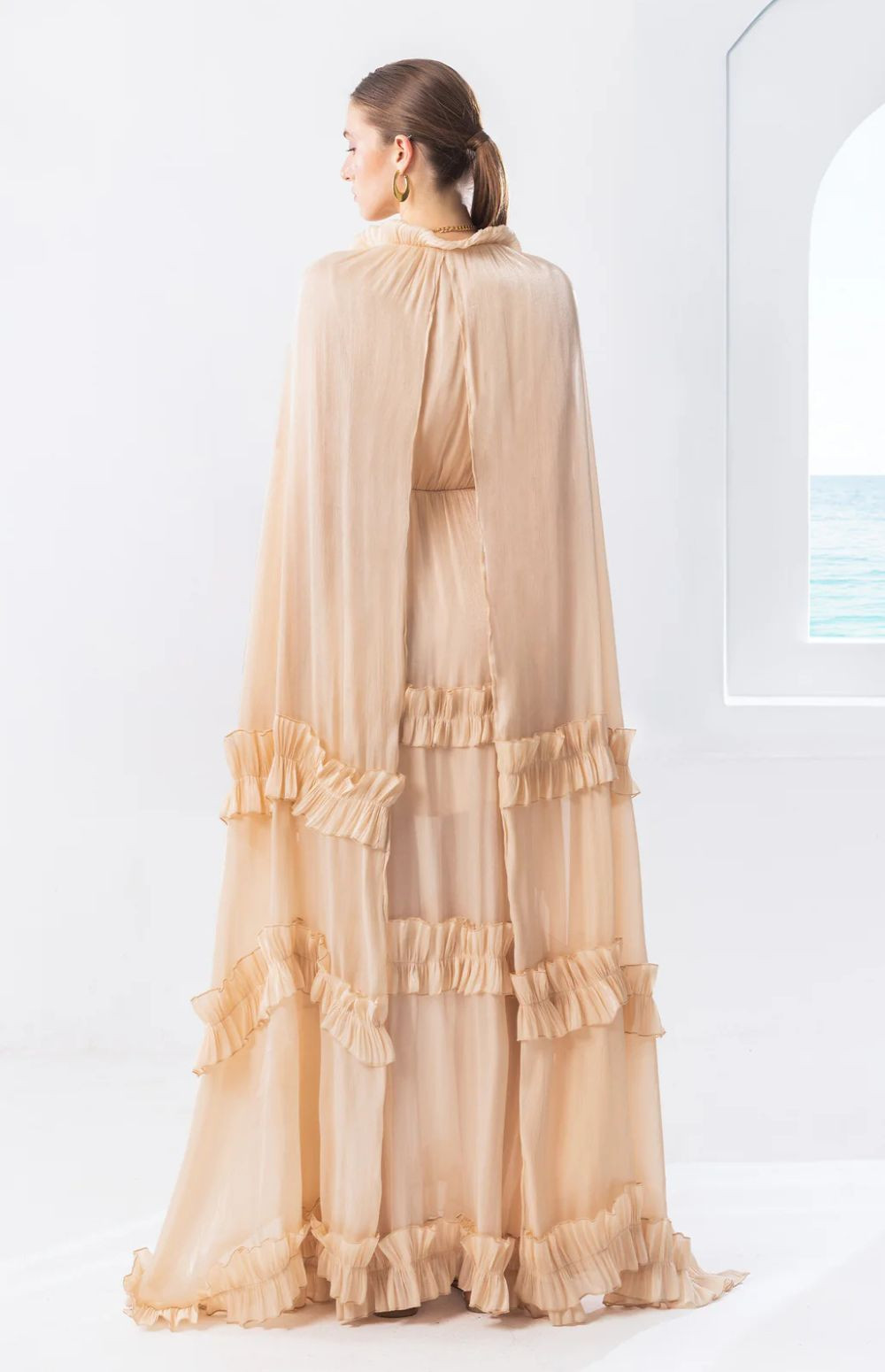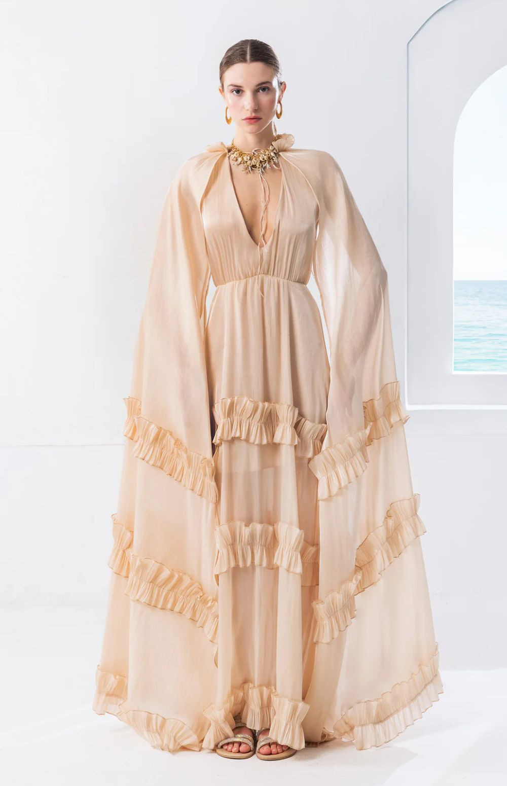 The dramatic cape-style long sleeves and layered ruffle details create beautiful movement with every step, offering a refined yet statement look.
