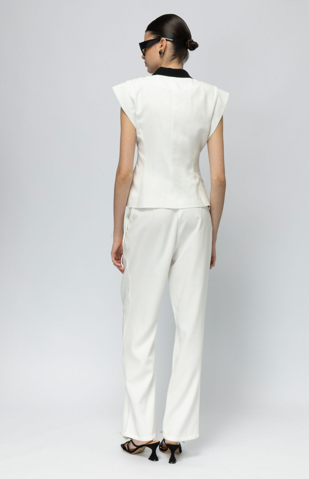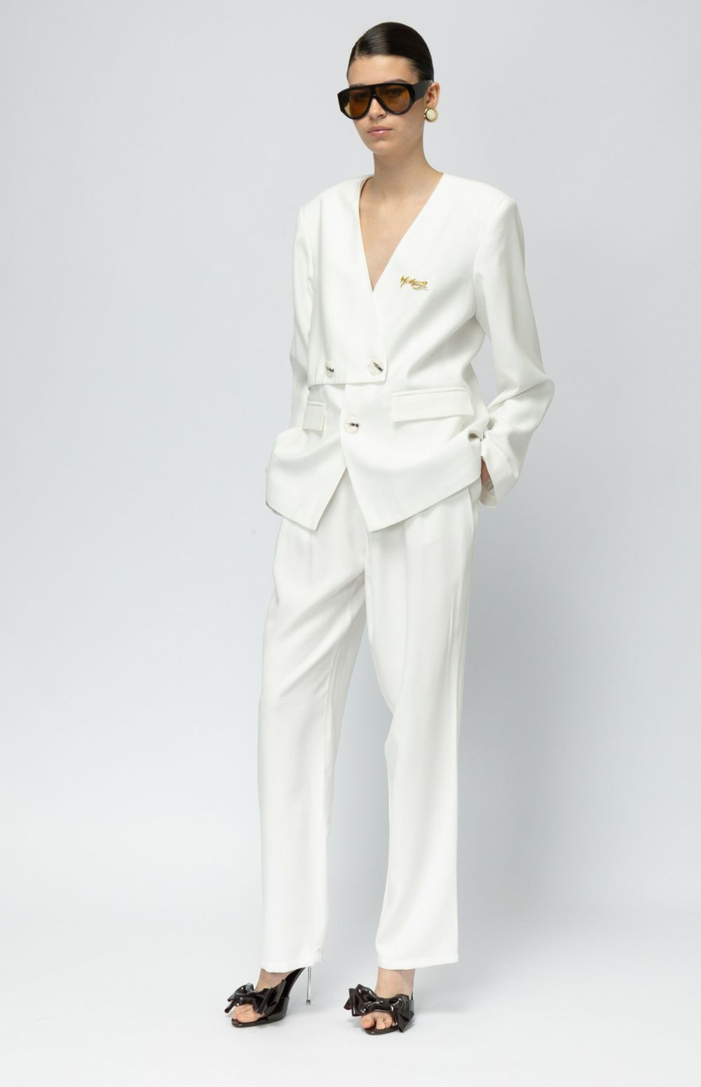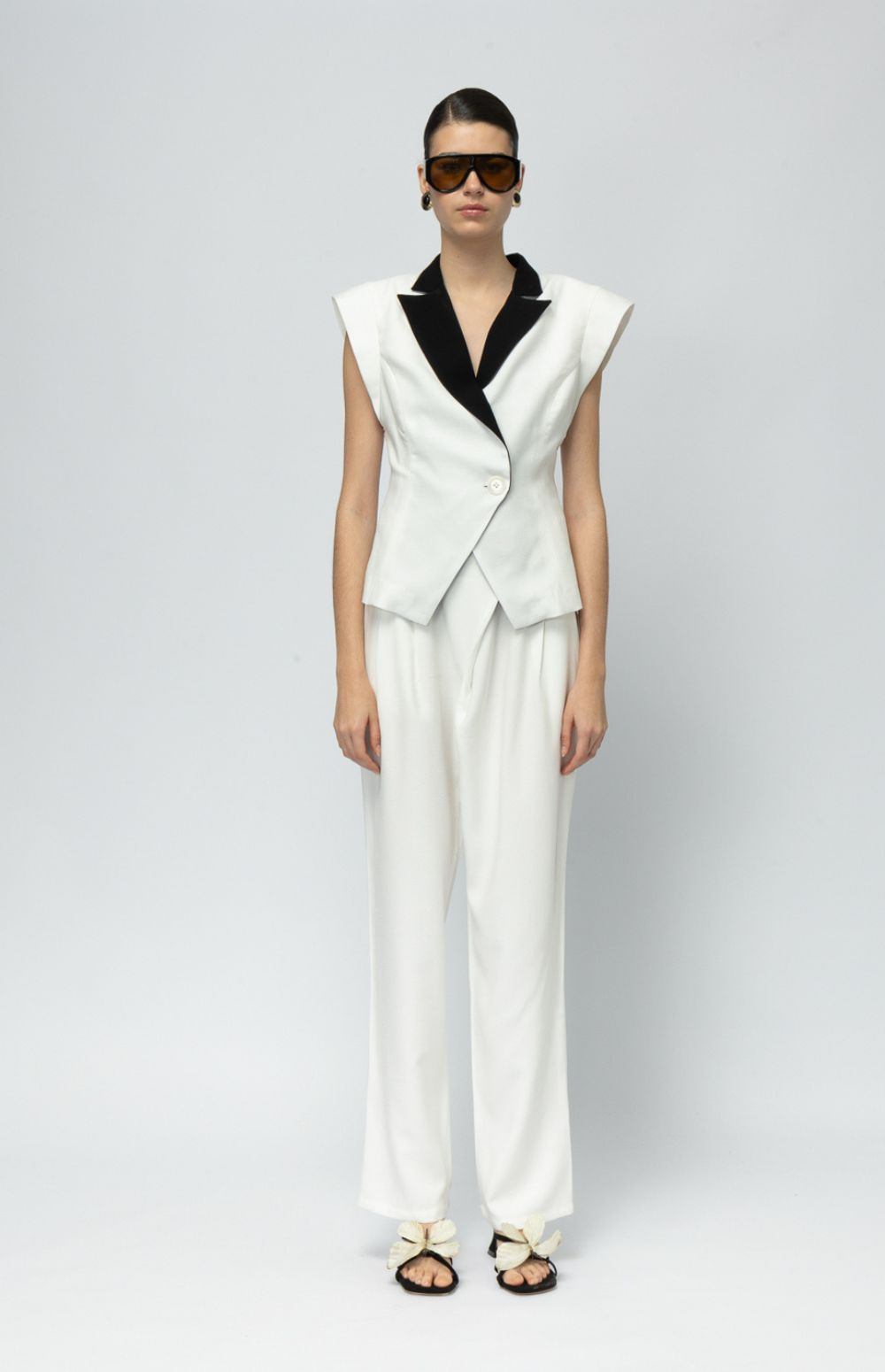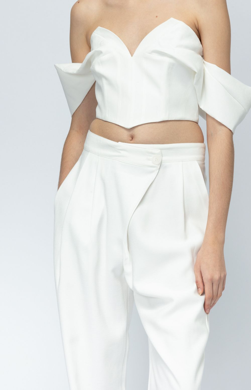 High-waisted white trousers with a soft drape and tailored finish