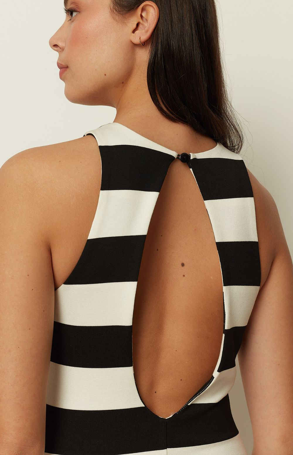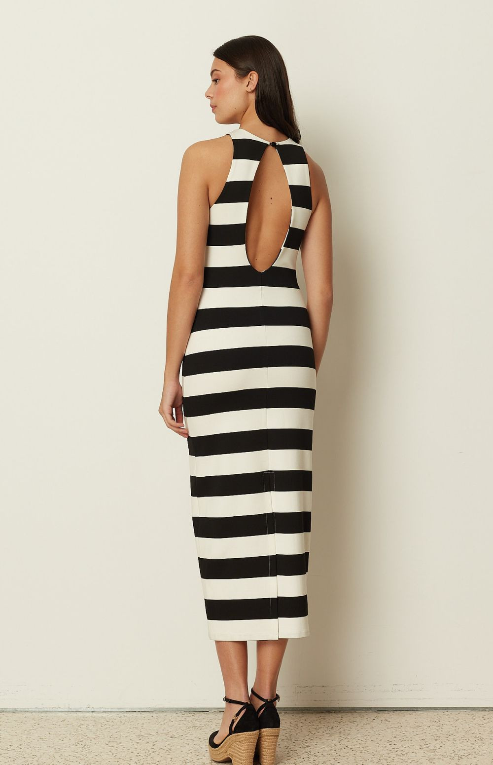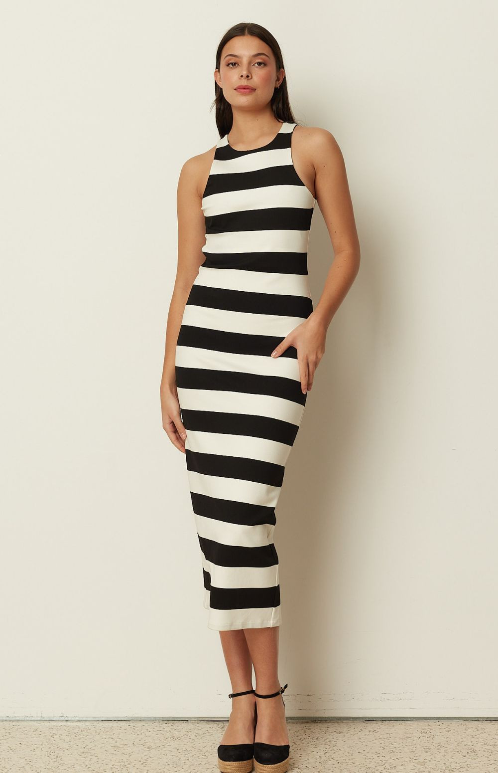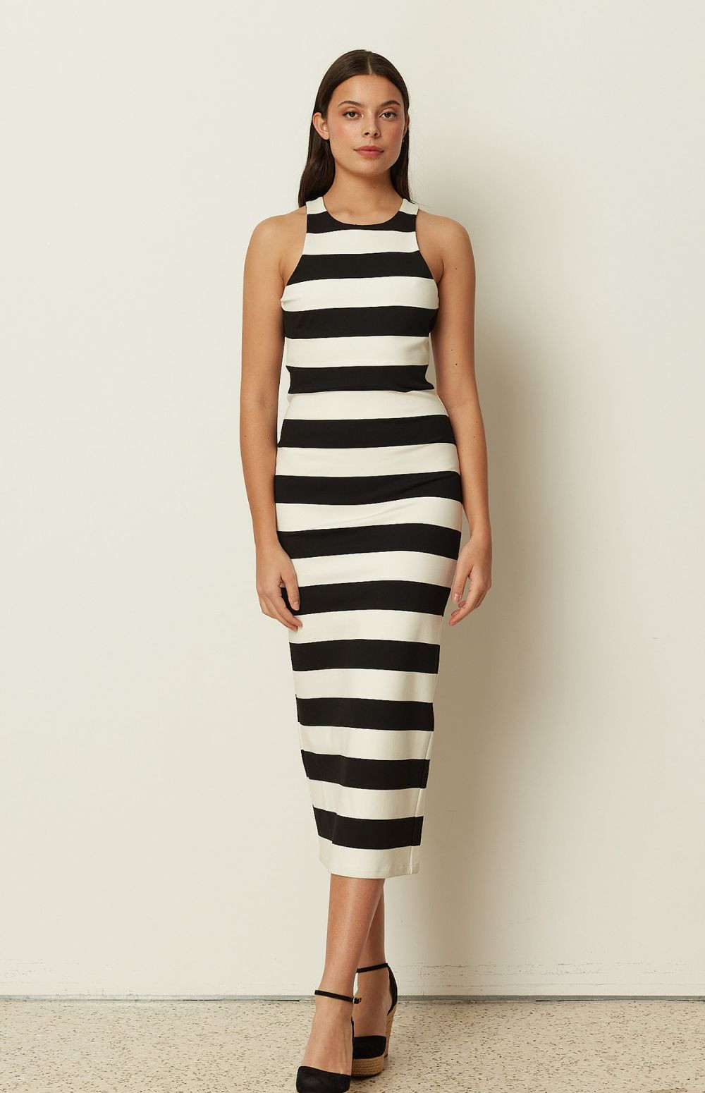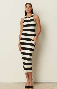 Clean, graphic, and timeless, this ckontova striped midi dress is designed in a sleek body-skimming silhouette that flatters and elongates the figure. Featuring a high neckline and sleeveless cut, it’s finished in bold horizontal black-and-white stripes for a modern statement. Wear it with flat sandals for effortless daytime polish, or add heels and minimal jewelry for a sharp evening look.