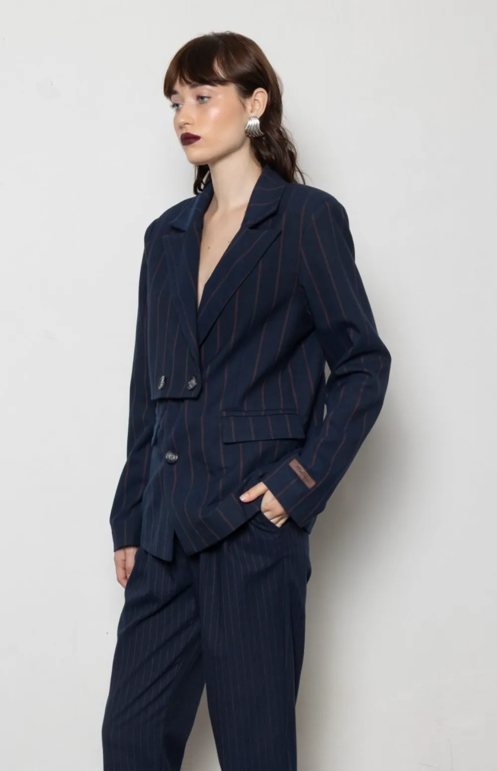 Double-breasted pinstripe blazer in blue – brown stripes with oversized shoulders and subtle logo embroidery label — structured, sharp, and effortlessly cool.