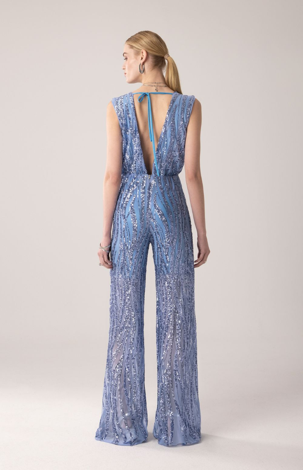 Elegant jumpsuit in a soft blue shade featuring striking silver sequin detailing in flowing wave patterns. Designed with a deep V neckline at the front and a dramatic open back with delicate neck tie fastening. The waist is gently defined, while the wide leg silhouette creates movement and elongates the figure. Perfect for evening events, summer weddings and special occasions.