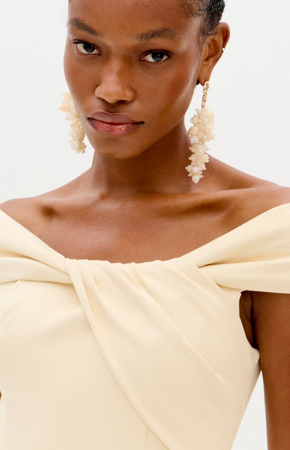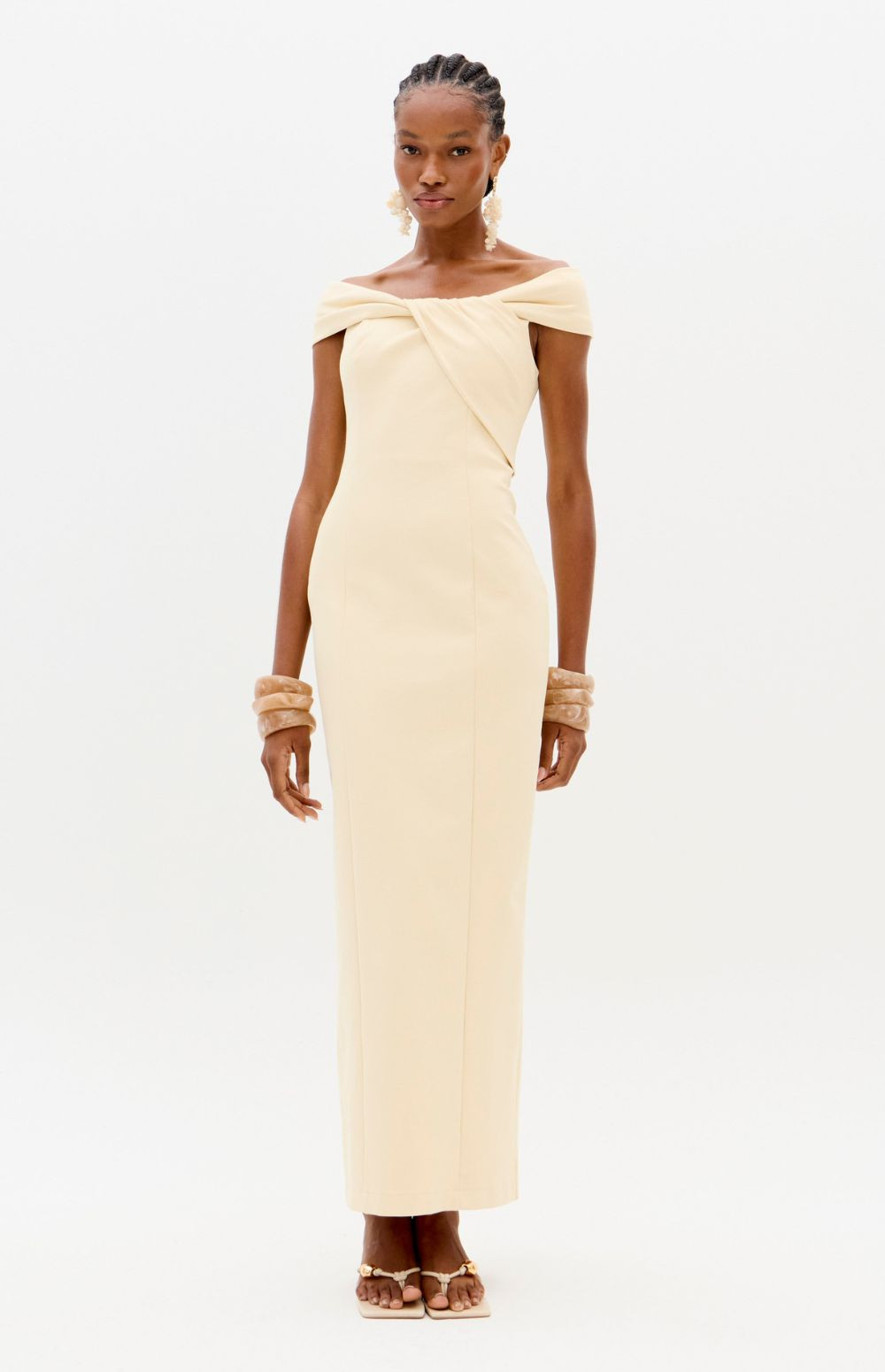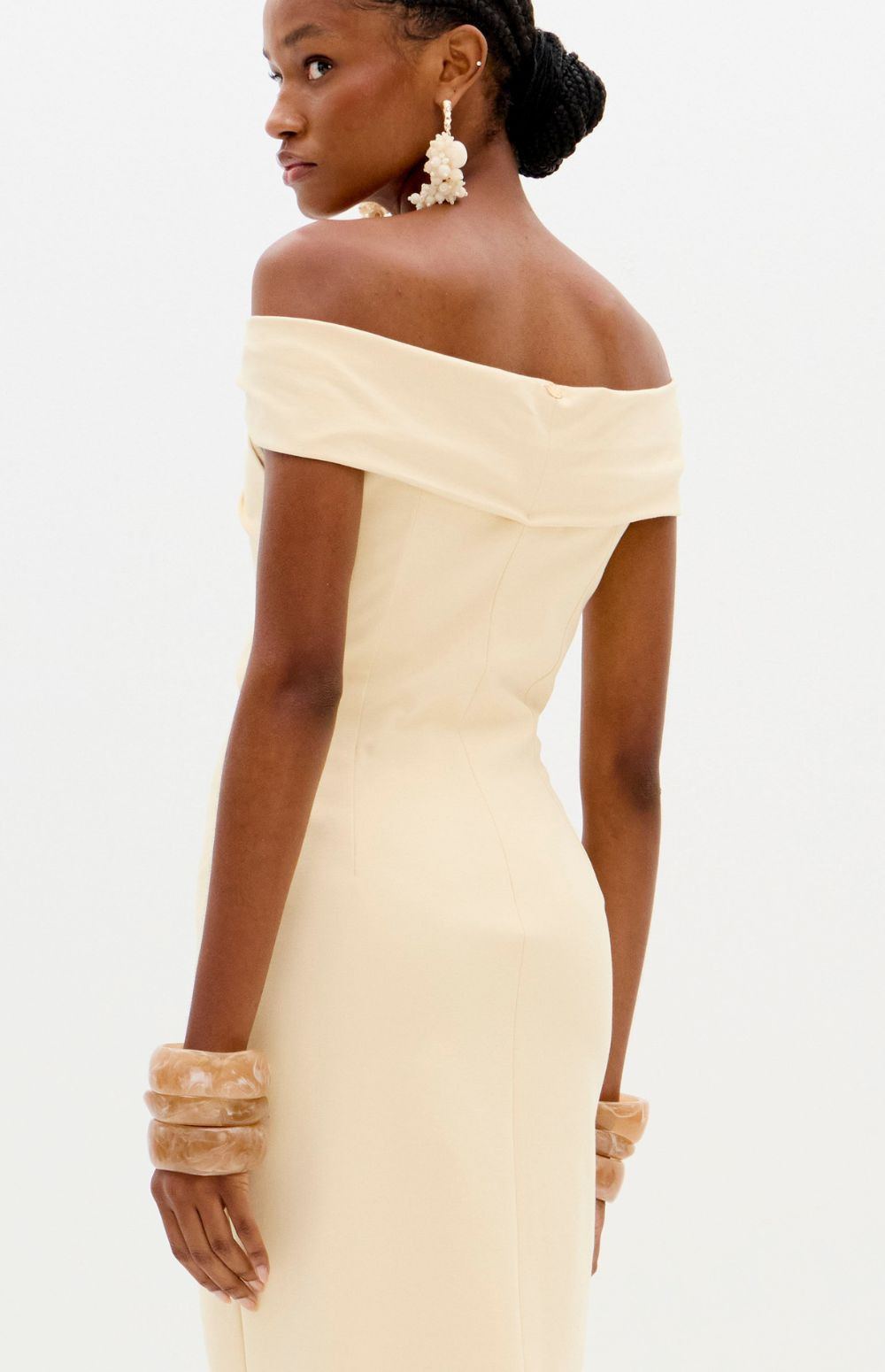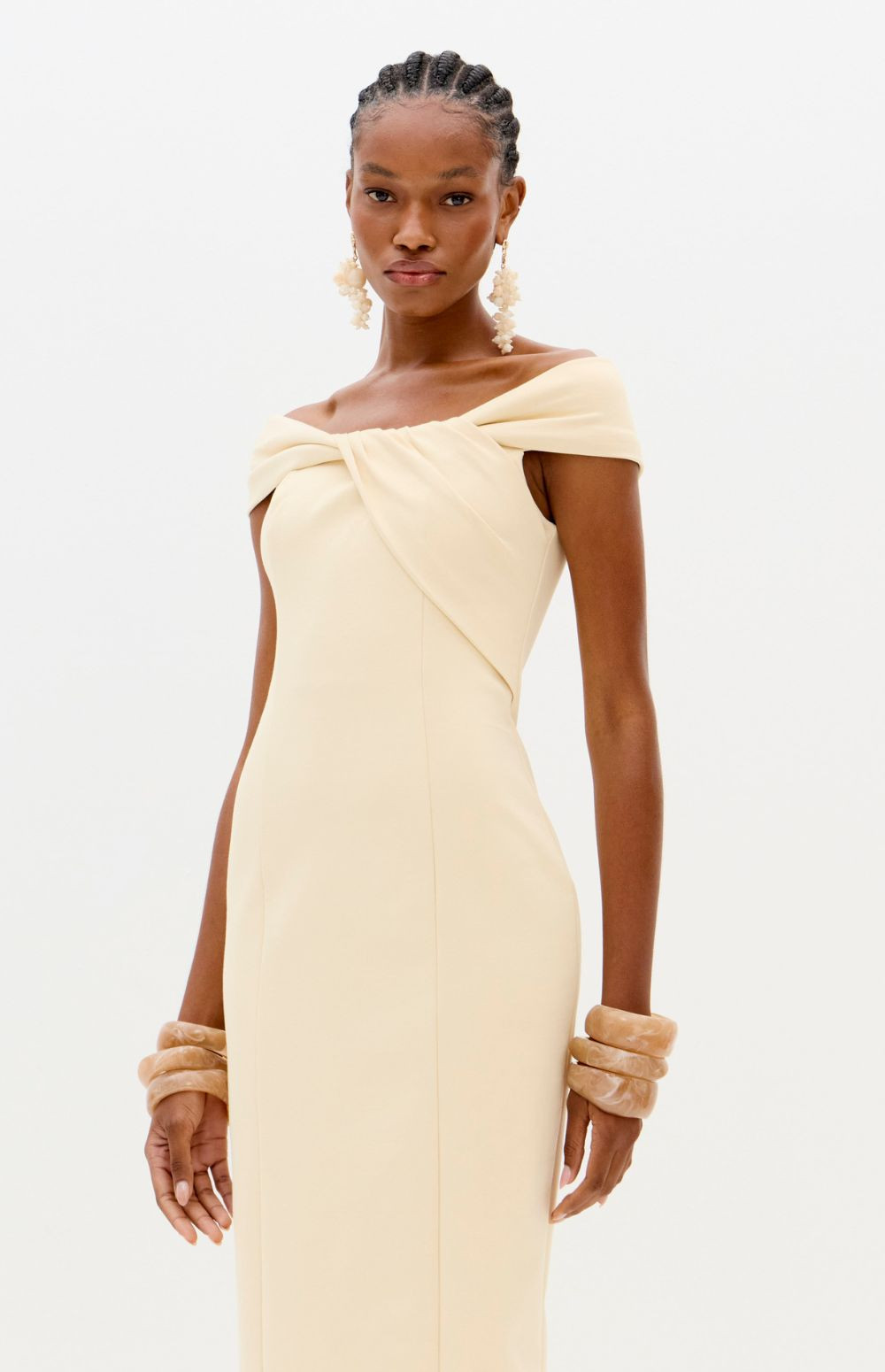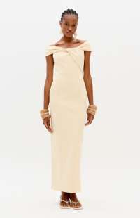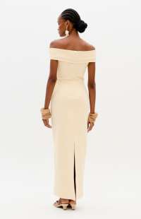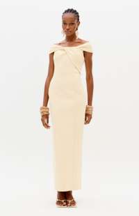 This super midi dress in a structured knit fabric features a body-hugging fit, a back slit, and a modern cut. Its unique feature is the off-the-shoulder neckline, which flatters the figure and adds instant sophistication to the look.