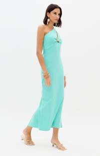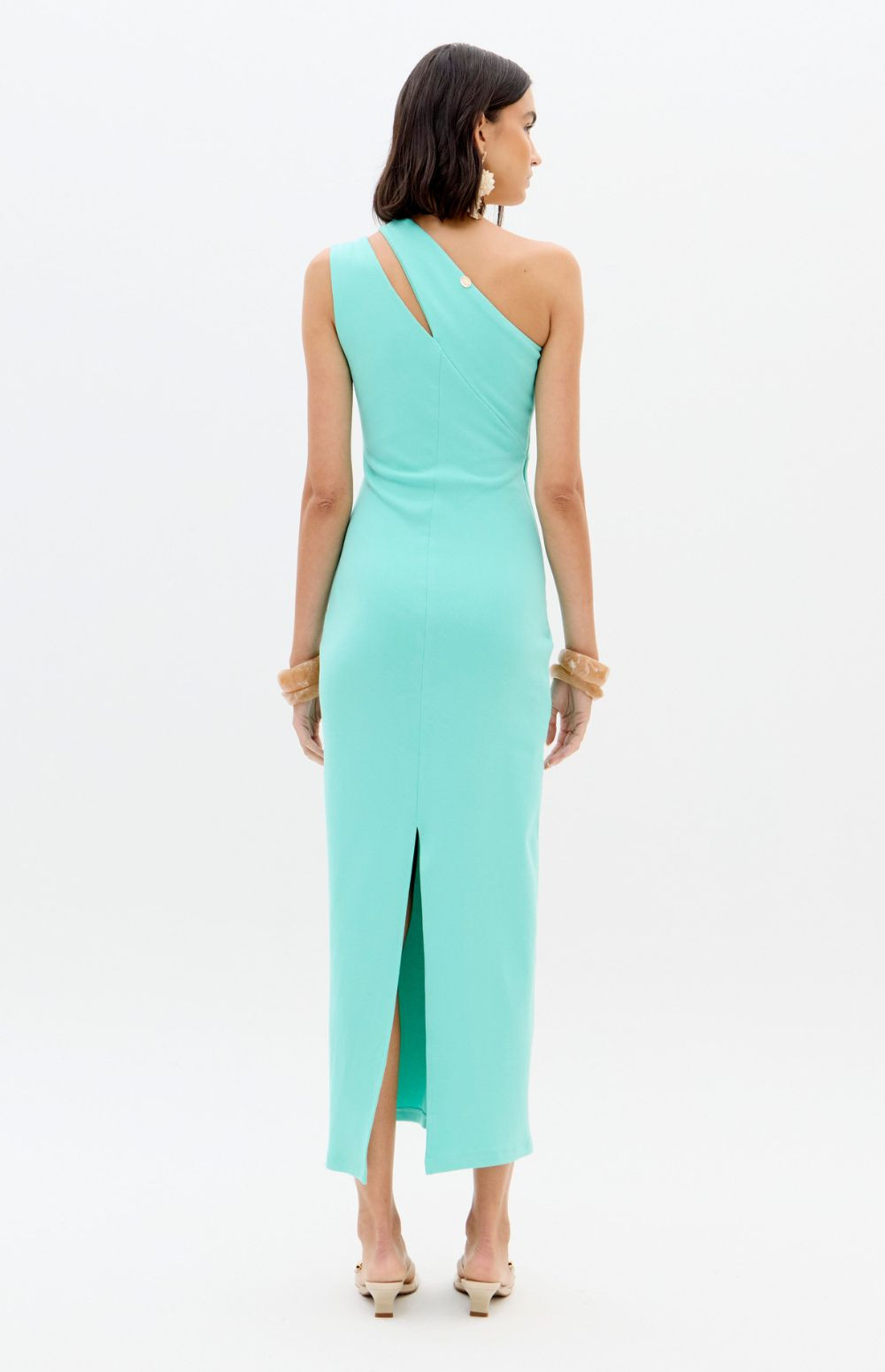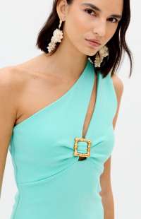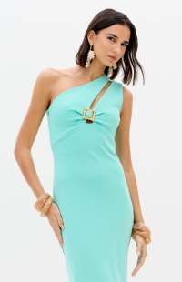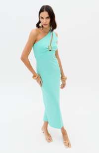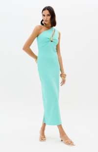 This super midi dress is made from a structured knit fabric with a body-hugging fit, a zipper closure, and a back slit. The one-shoulder design gains sophistication with a cutout adorned with a belt loop, becoming the highlight of the look