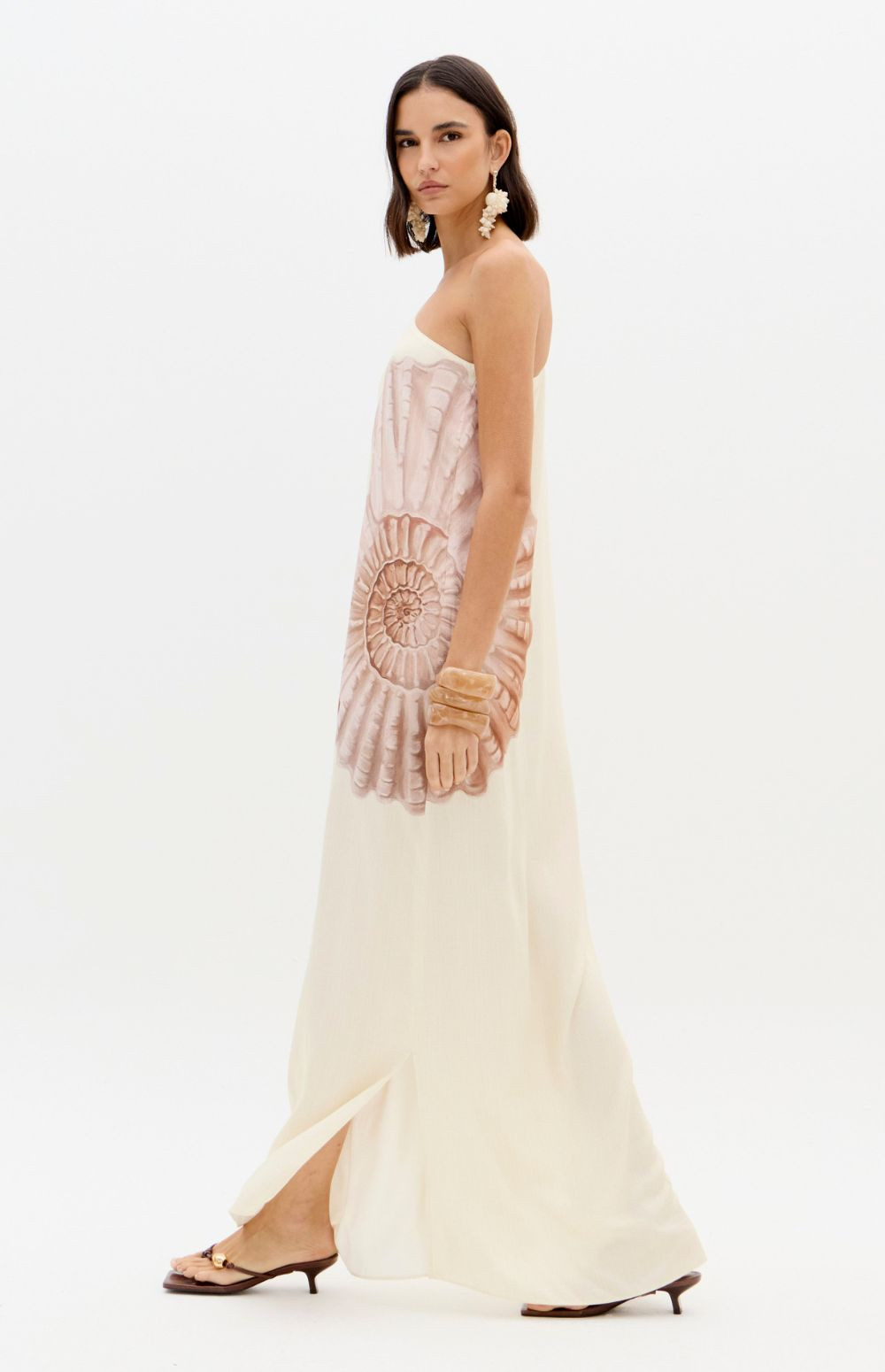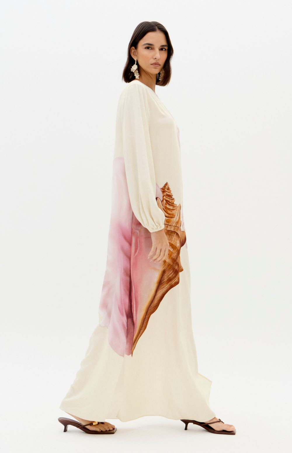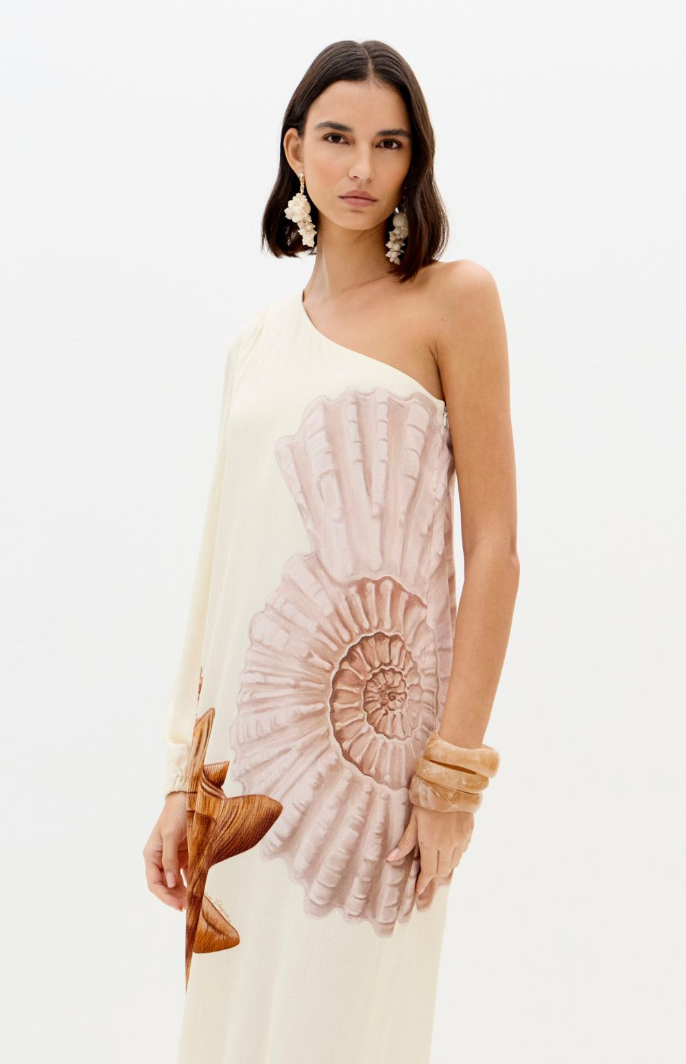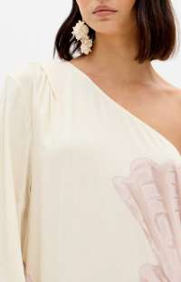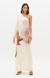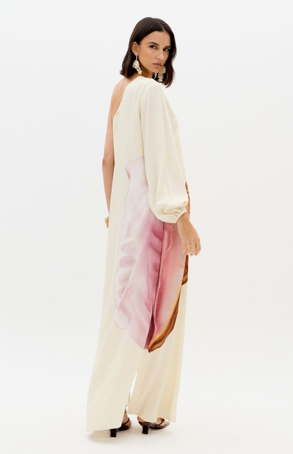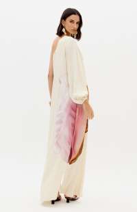 This super midi printed dress is made from lightweight, flowing fabric. It features a one-shoulder design with long sleeves, fitted cuffs, and a loose fit, as well as a side slit that allows for movement. The zipper closure adds practicality to the design.