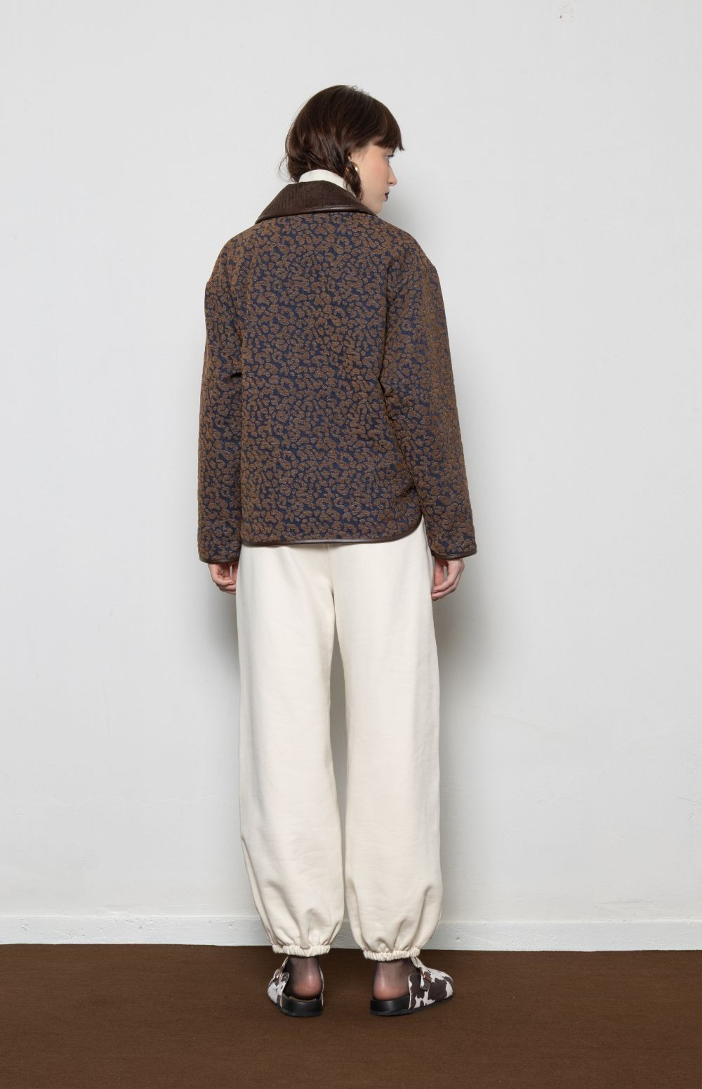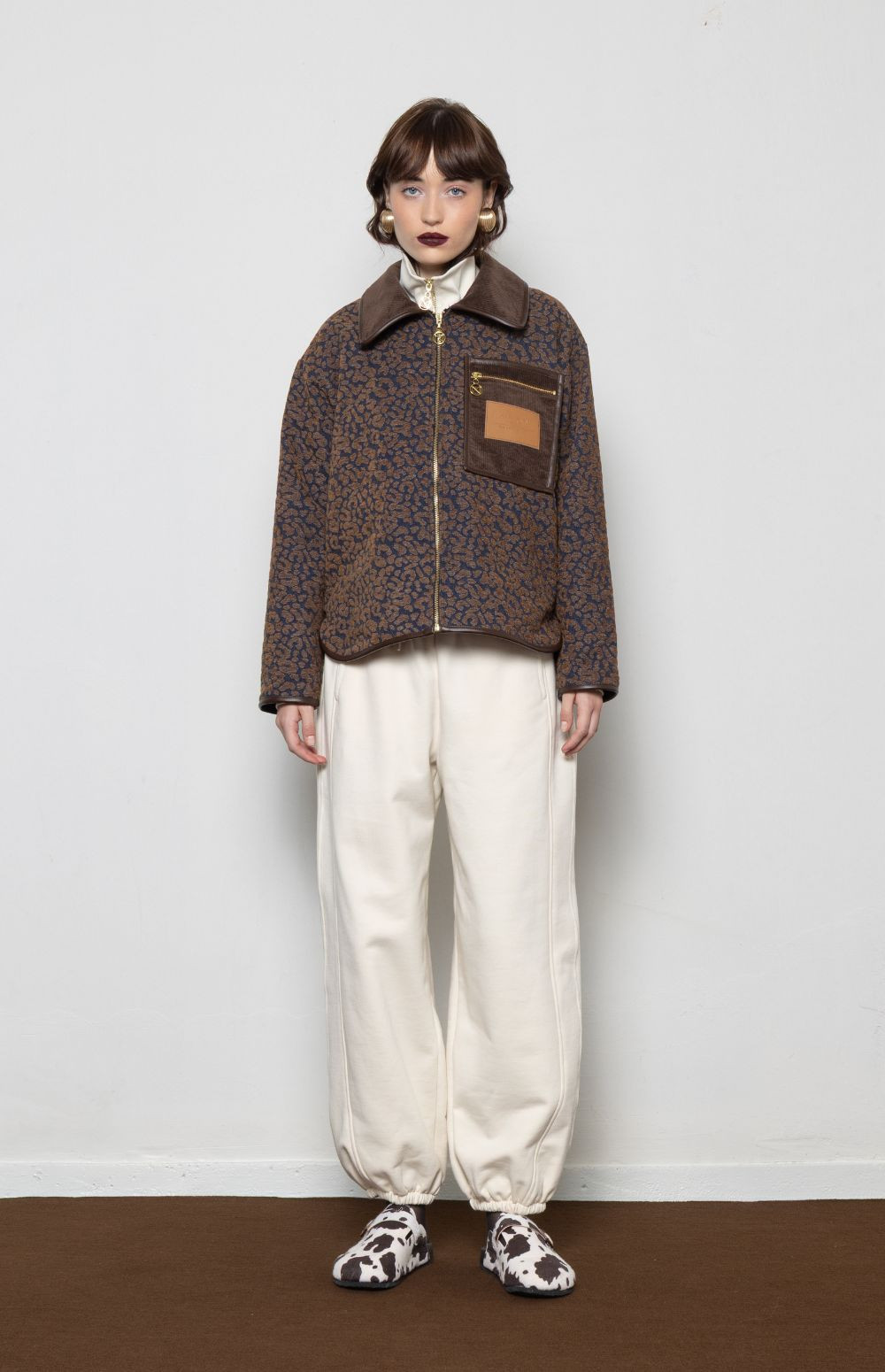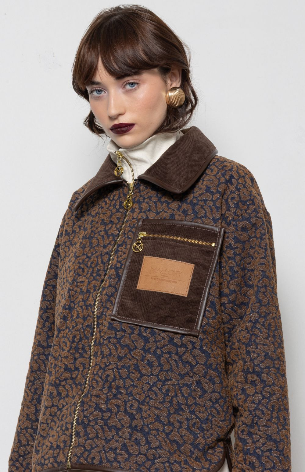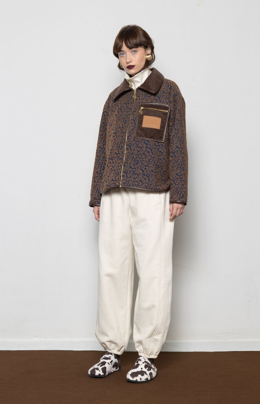 Boxy zip-up jacket in a leopard jacquard fleece with contrast corduroy collar and chest pocket —warm, retro-inspired, and effortlessly cool.