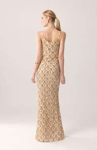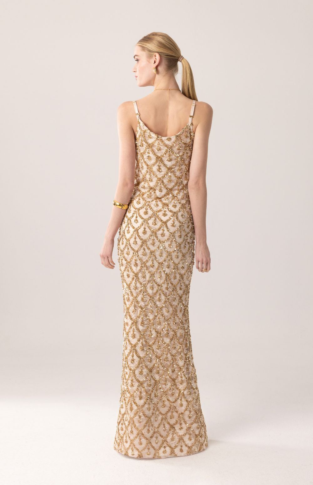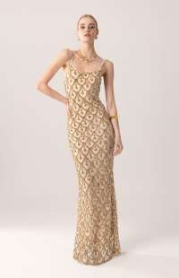 Maxi dress in a radiant gold shade featuring a nude base adorned with intricate gold sequin embroidery. Designed with delicate adjustable straps and a clean straight neckline, it enhances the shoulders while the fitted silhouette elongates the figure. A refined evening statement piece that embodies timeless glamour.