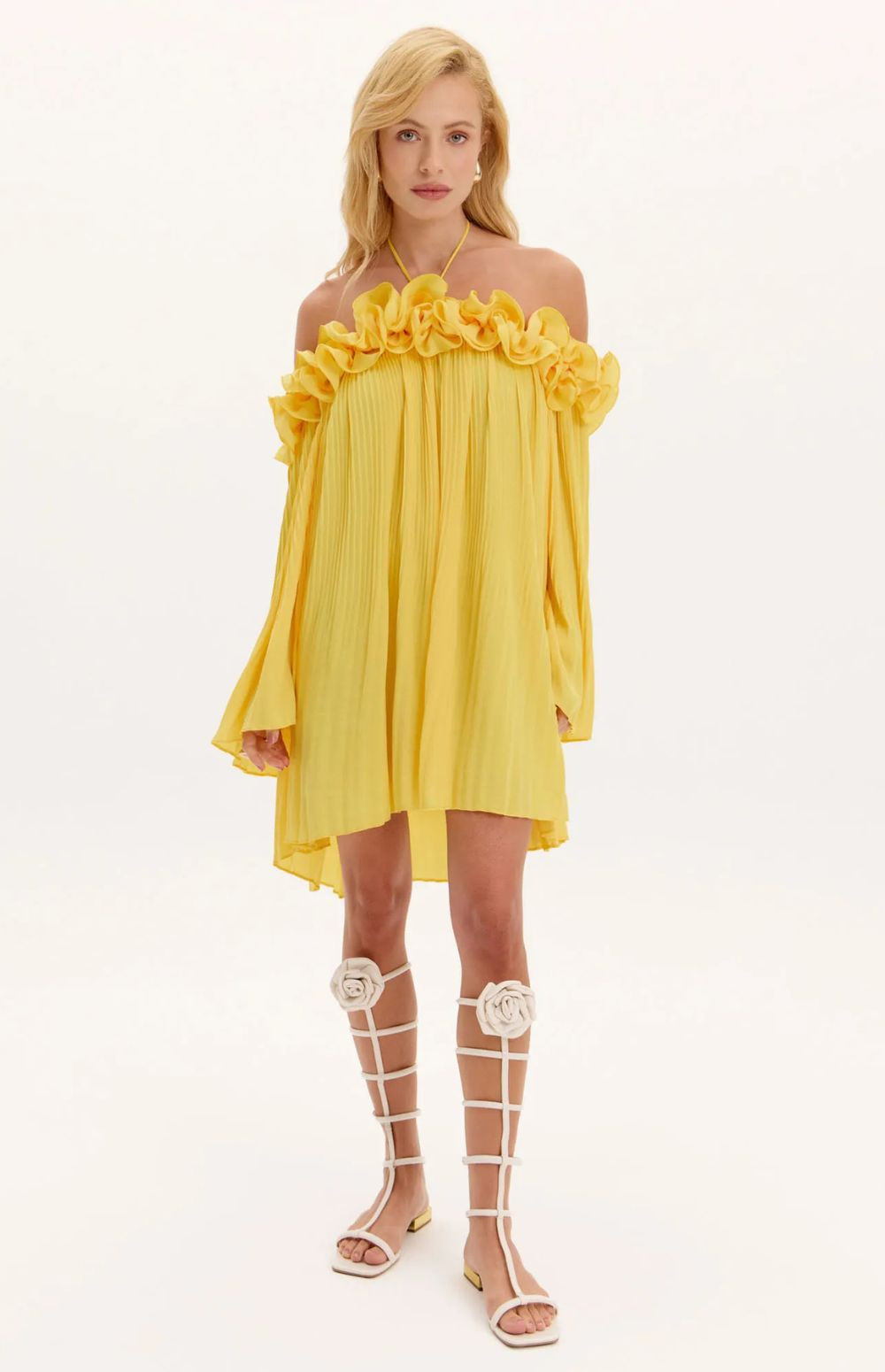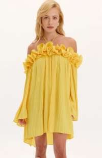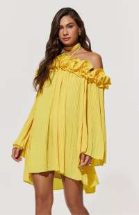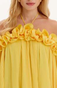 Yellow Pleated Dress with 3D Flowers