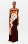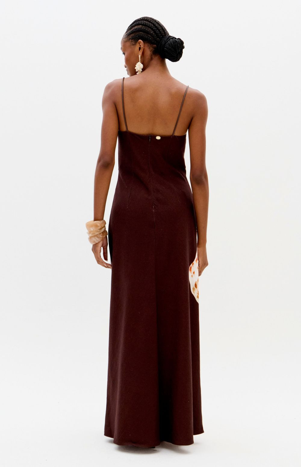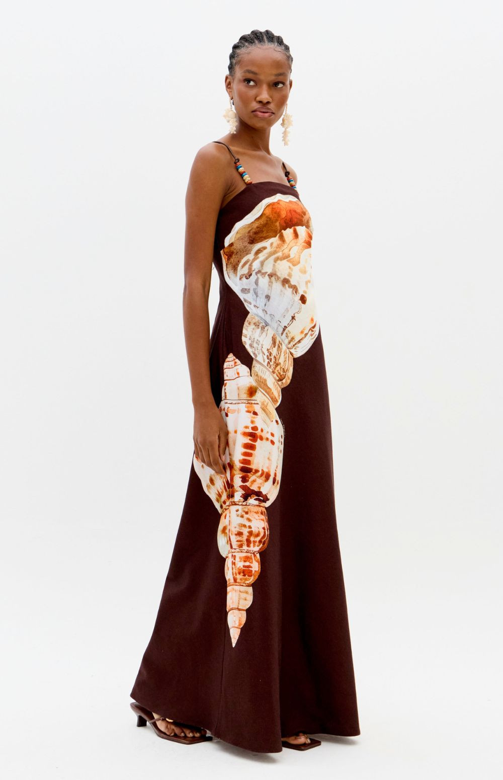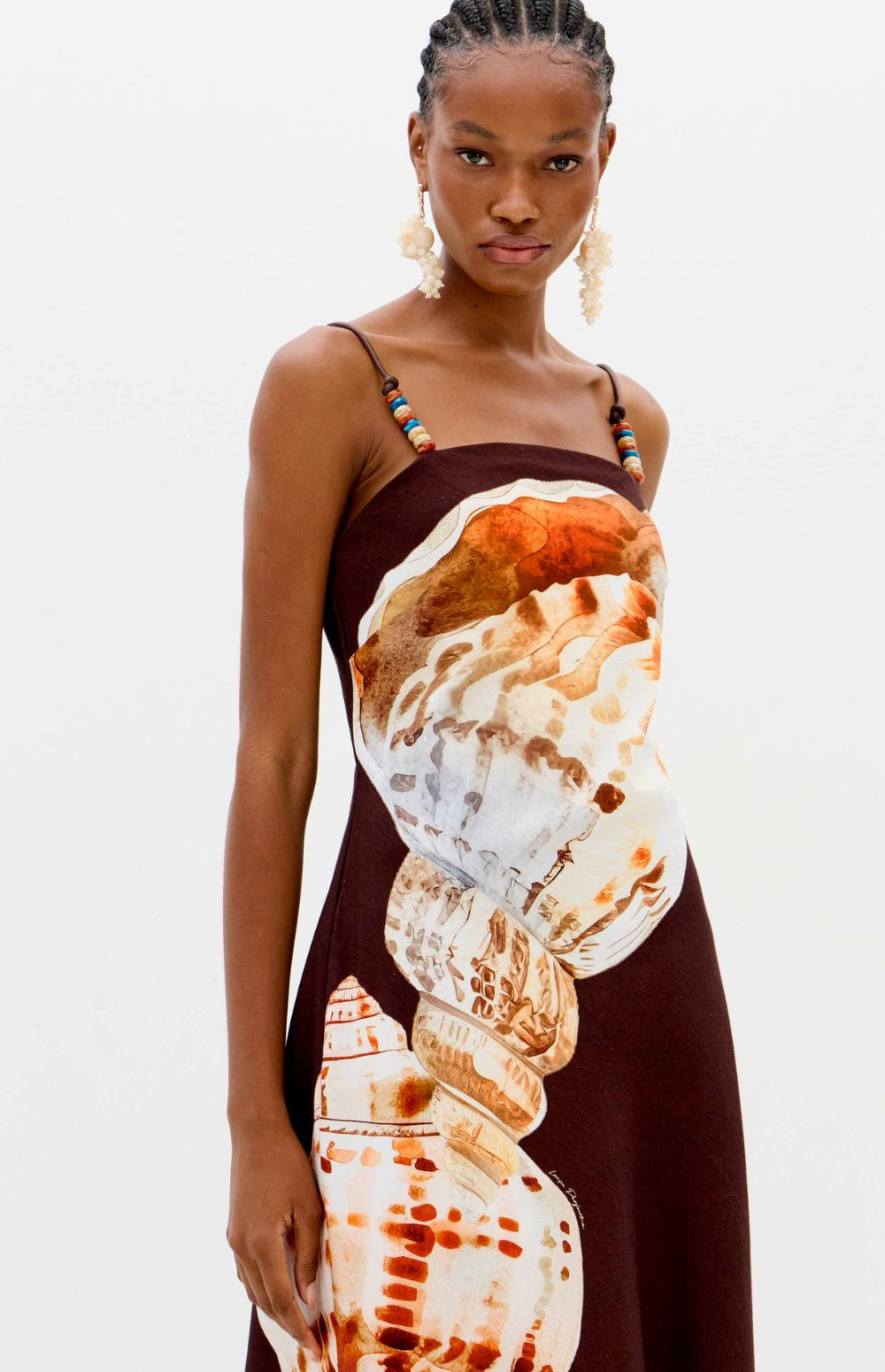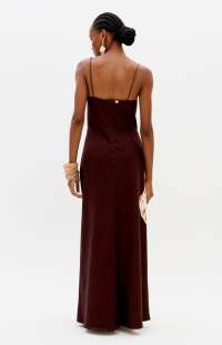 This super midi dress, made from a structured, non-stretch fabric, features a straight neckline, a back zipper, and thin straps adorned with beads. The A-line silhouette has a fitted bodice that flows delicately and smoothly towards the hem.