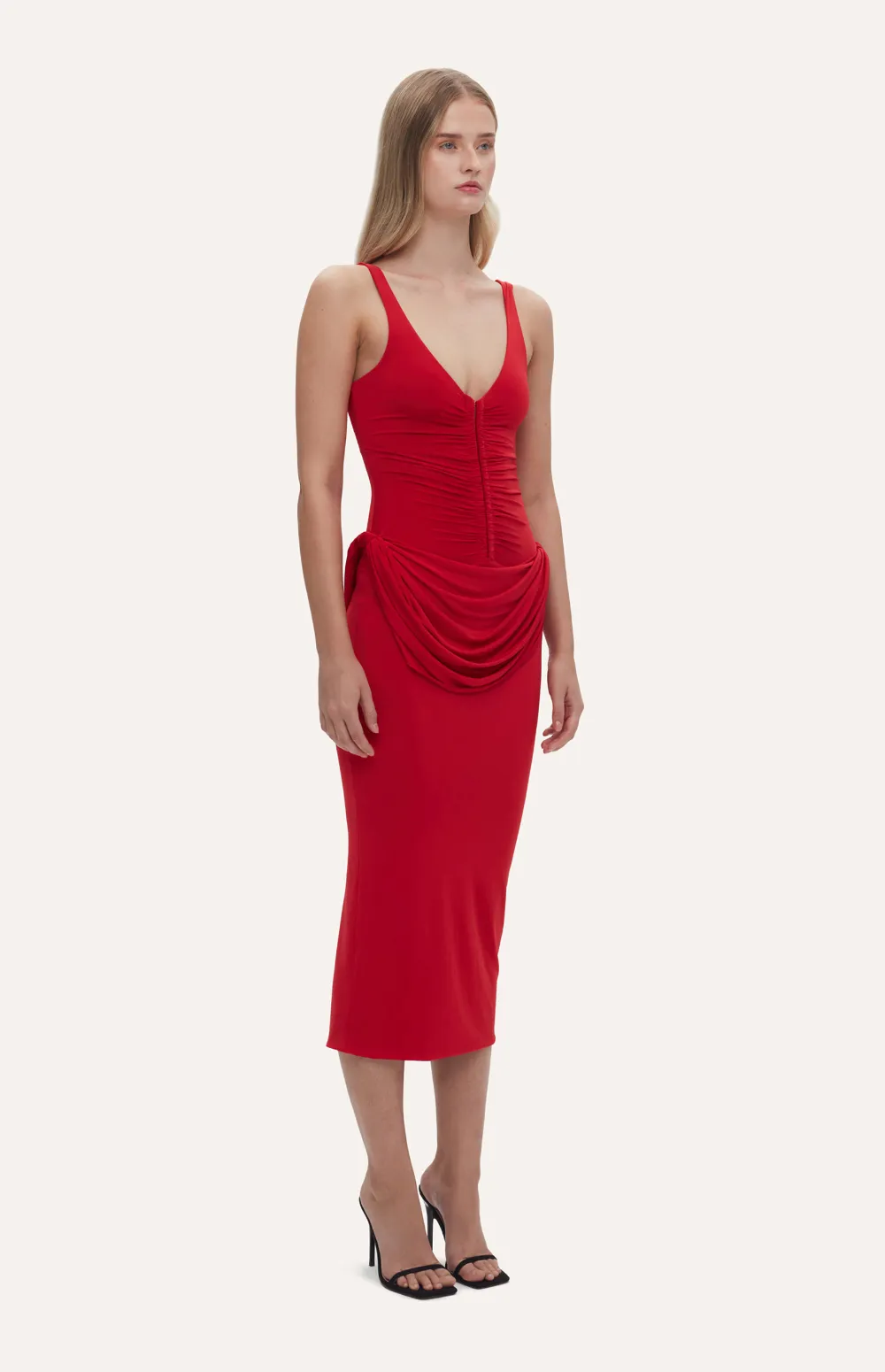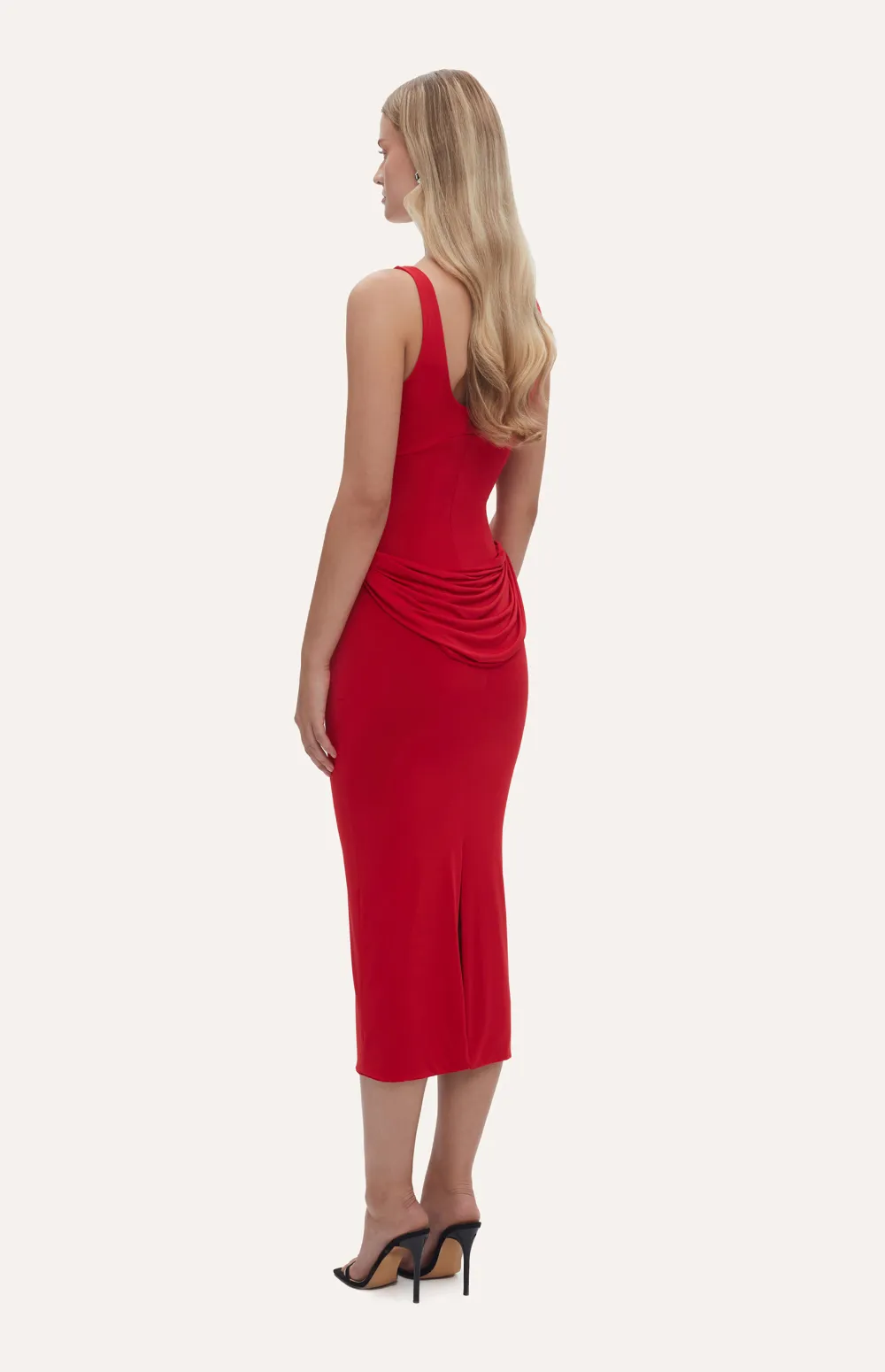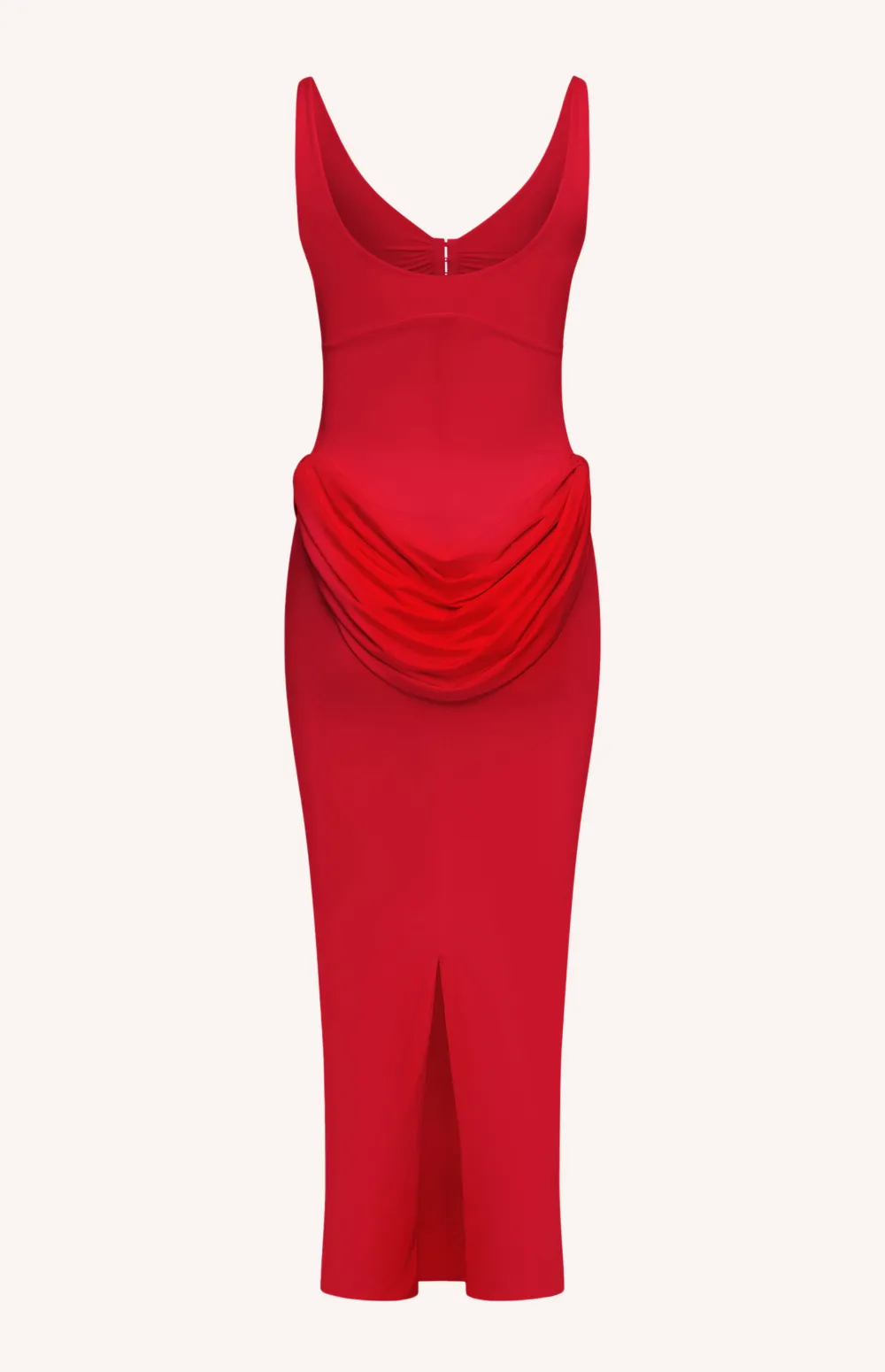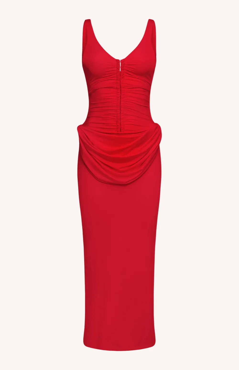 A corset midi dress with a plunging V-neckline and super-jersey fabric gives a sultry modern look. A nautilus-shaped draped skirt designed to embrace your silhouette, for an easy-to-wear yet ideal for a glamorous appearance.