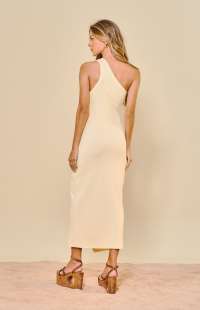 Midi dress with one shoulder and ribbed slit.